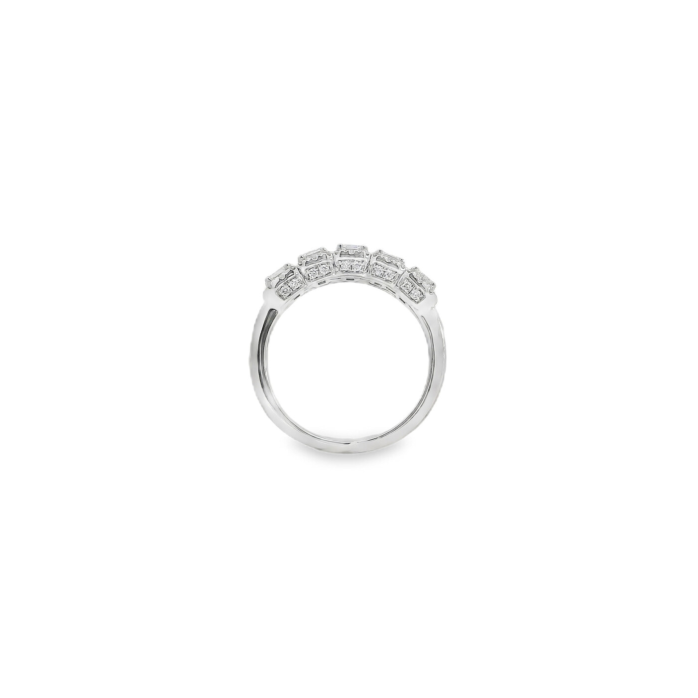 This bold 5 stone band brings timeless sophistication with striking emerald cut diamonds set in polished 10K white gold. Its substantial design makes a confident, radiant statement on its own.
