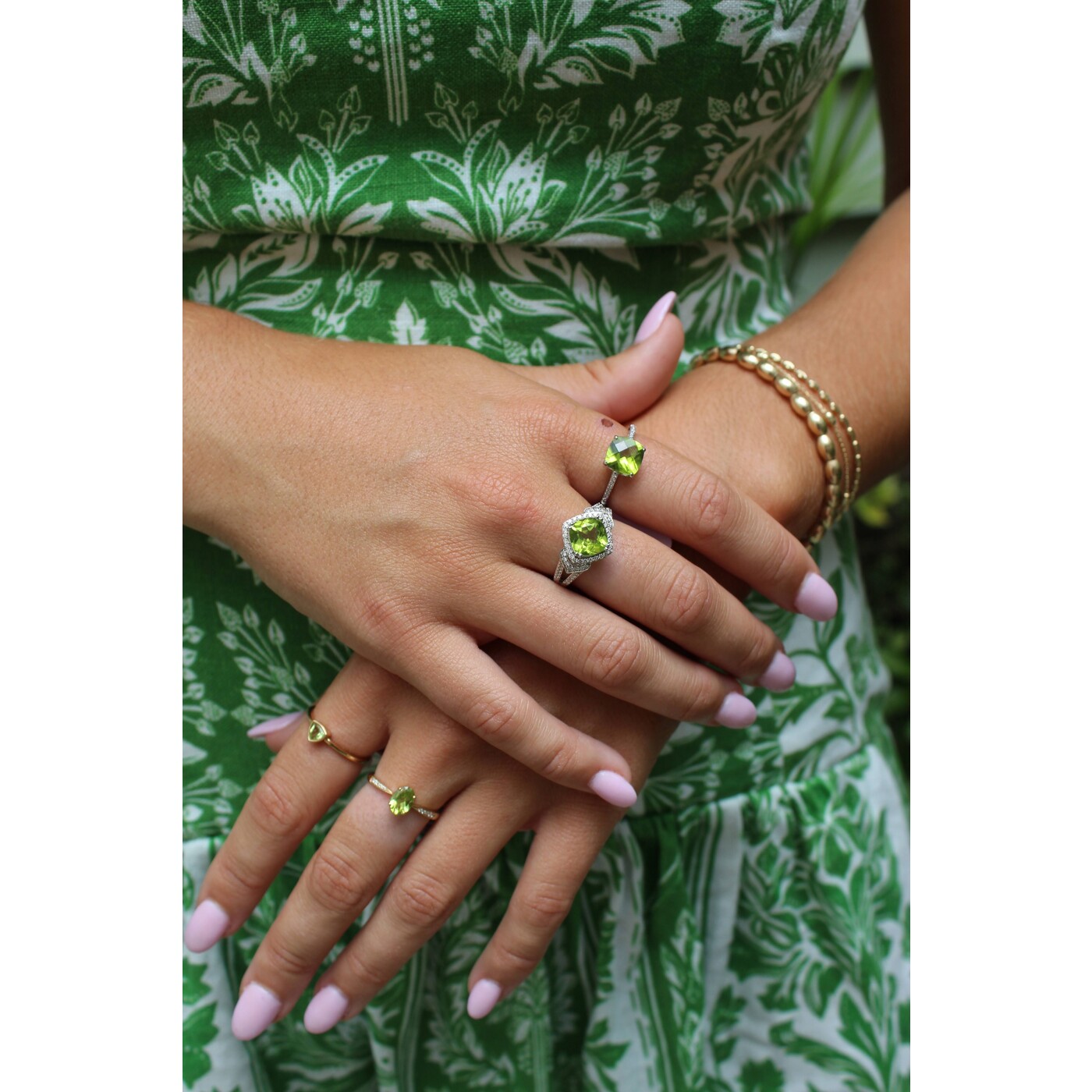 Stones: (1) Cushion Cut Peridot weighing 2.15 Four Prong Set & Brilliant Round Cut Diamonds equaling .36 Carats G-H Color SI1 Clarity