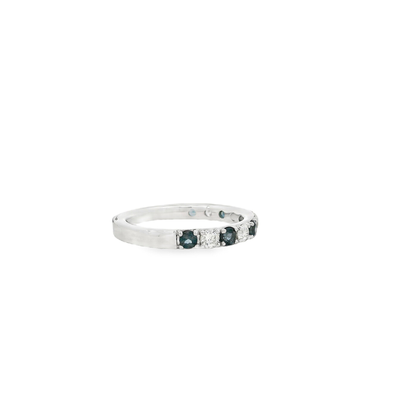 This 10K white gold band pairs rich London blue topaz with diamond accents in a balanced, polished design. The contrast of deep blue and bright sparkle creates a bold yet classic look with timeless appeal.