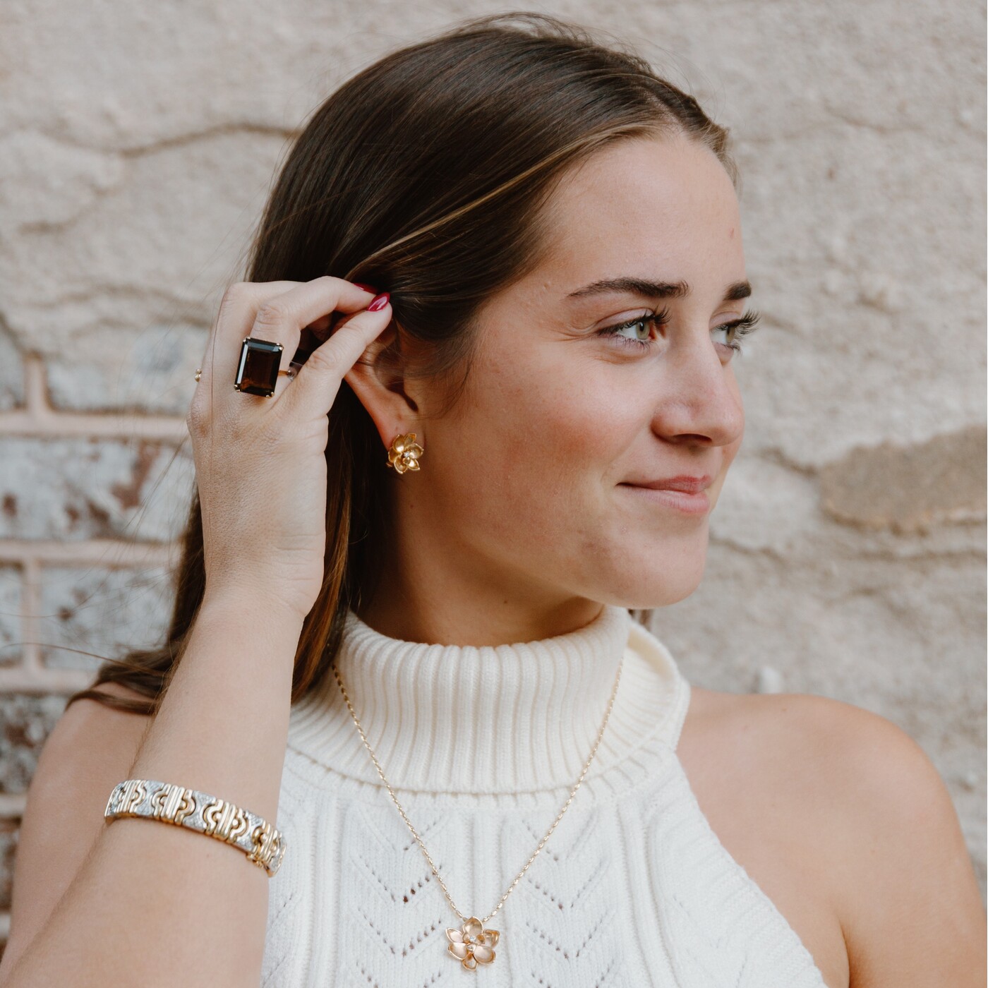 This vintage ring features a rich smoky quartz solitaire set in yellow gold. With warm tone and bold presence, it captures the spirit of the 1970s.