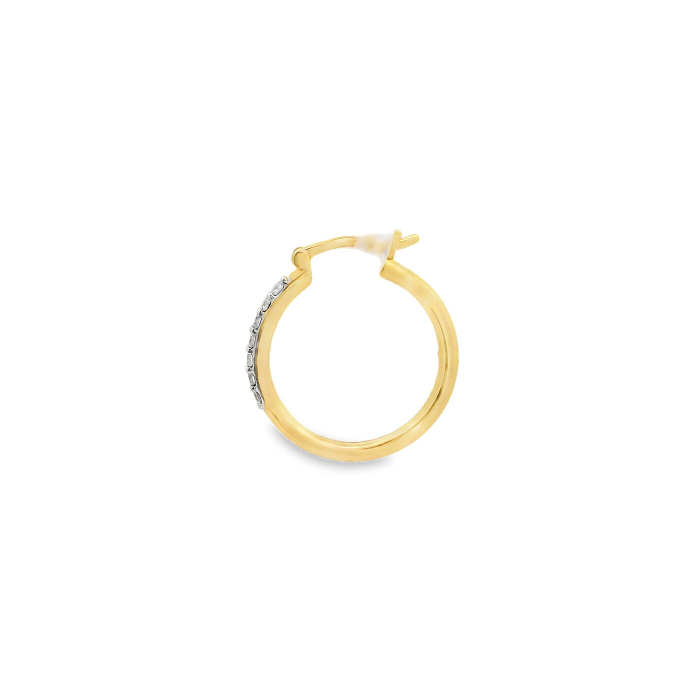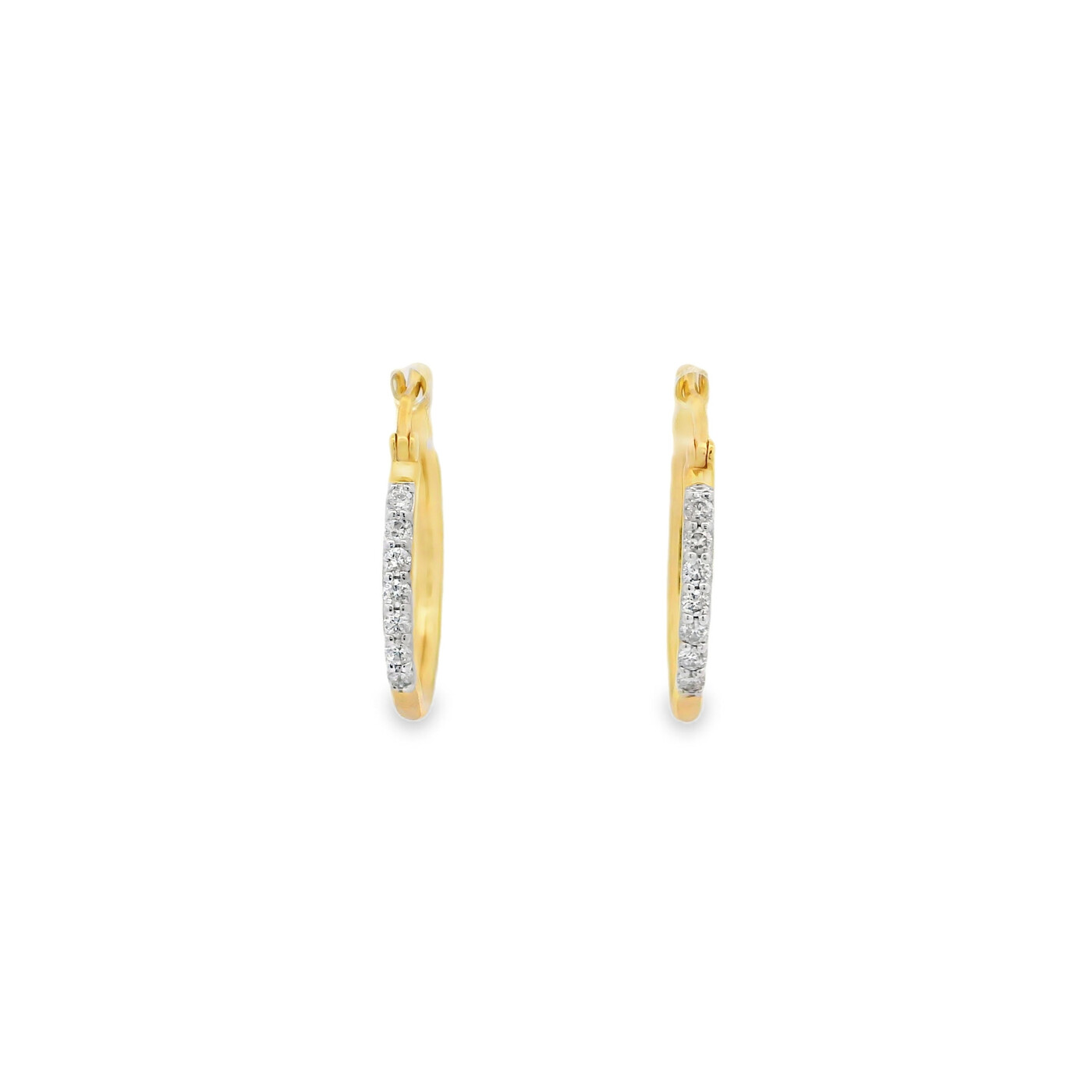 ITEM#: GCB00009443Yellow gold hoops shimmer with diamond accents, blending polished brilliance with classic sophistication. Their refined design offers timeless elegance for effortless everyday style.