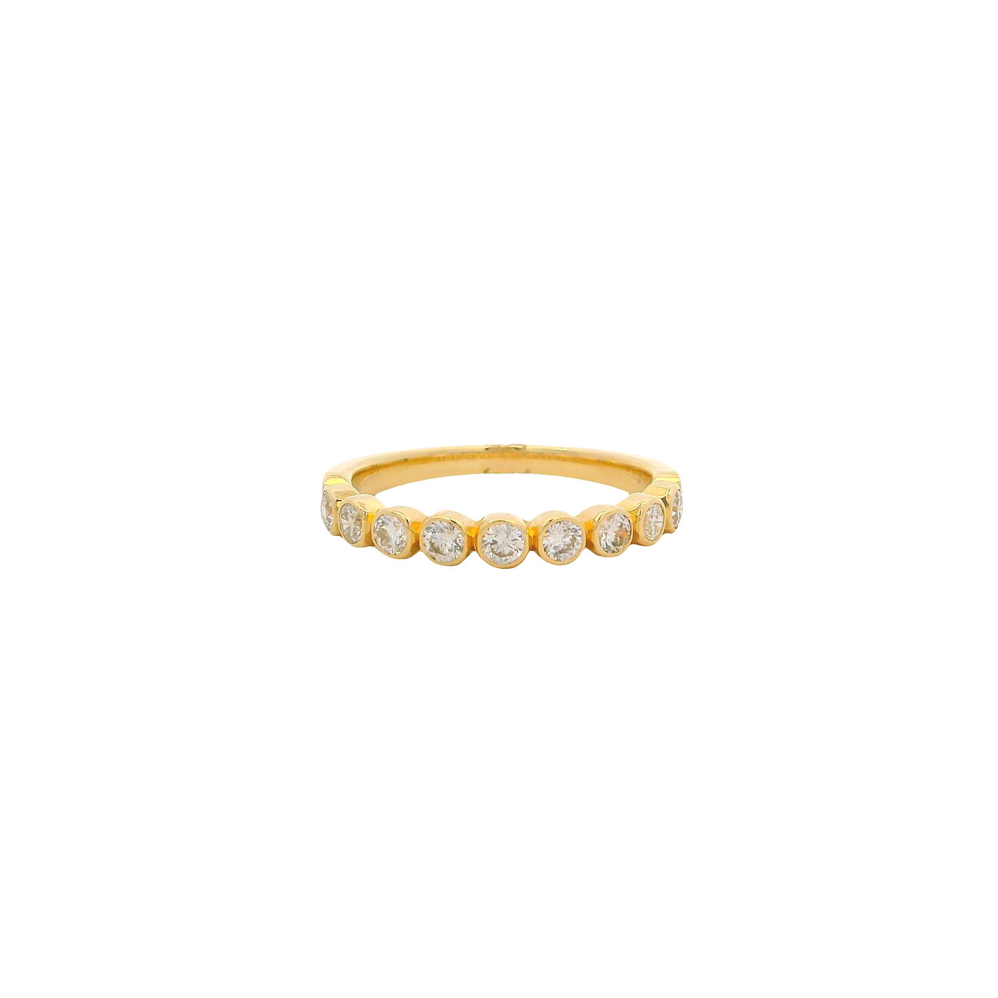 This yellow gold band showcases bezel-set round diamonds. Elegant and refined, it offers timeless sparkle and classic sophistication.