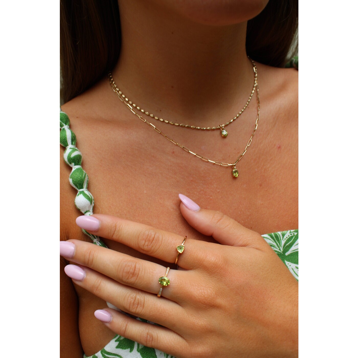 Discover the beauty of this elegant gold ring featuring a stunning peridot gemstone at its center. The vibrant green hue of the peridot is complemented by delicate accents, making it a perfect choice for any occasion.