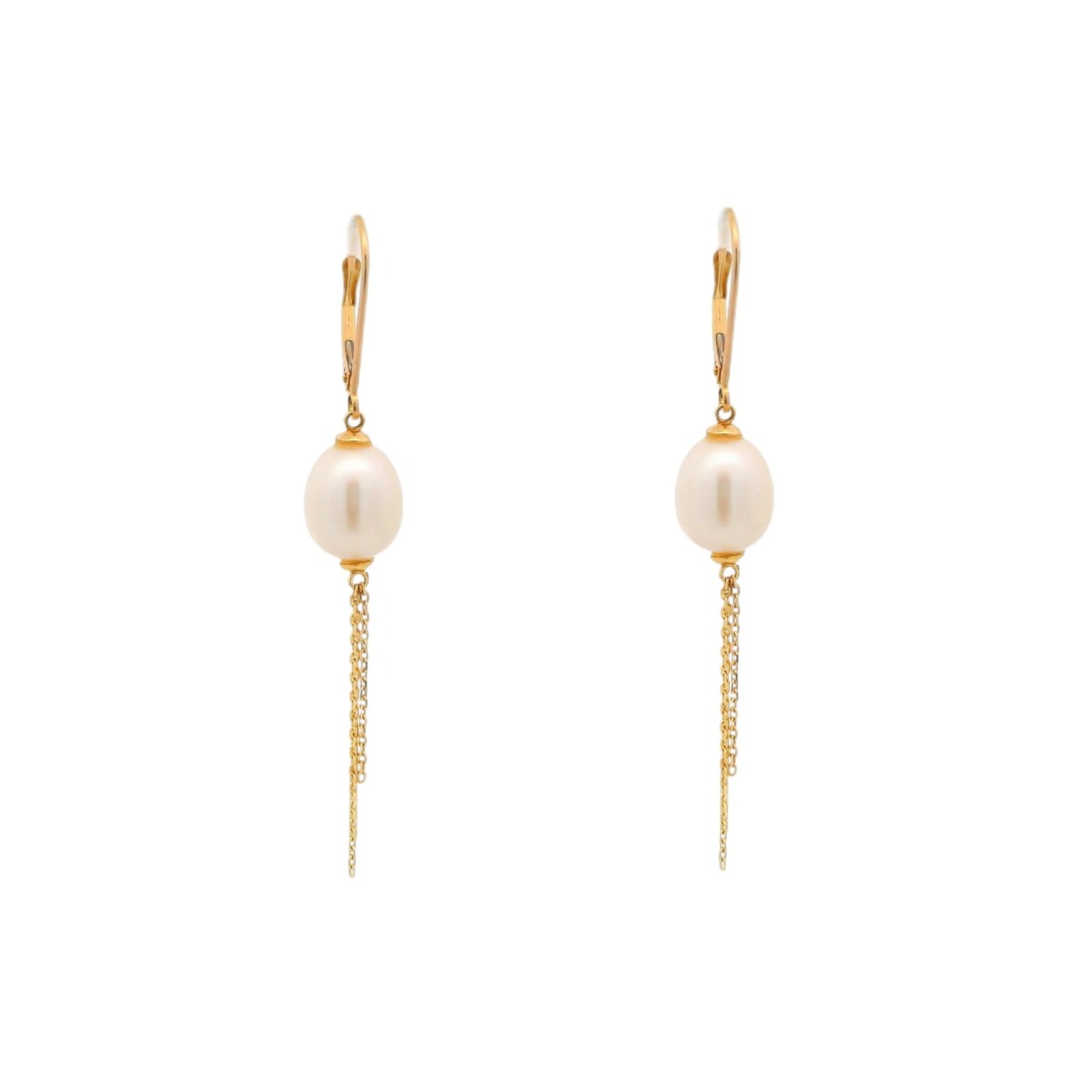 10K Yellow Gold 9-10mm White Freshwater Pearl Tassel Dangle Earrings