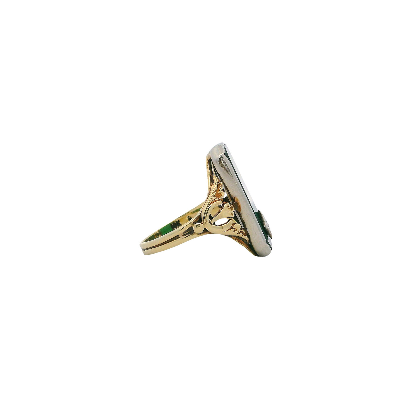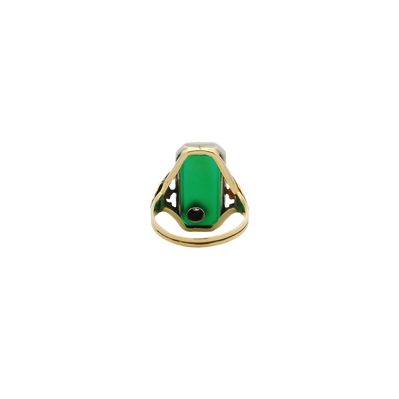 This 1930s yellow and white gold Art Deco ring features a sparkling diamond paired with chalcedony. The geometric design highlights vintage elegance in a timeless, refined silhouette.