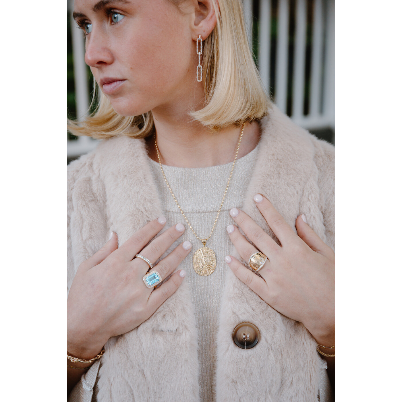 This in-house design was inspired by the “Bread Basket” style of baskets sewn in the Lowcountry. This new spin on our classic round sweetgrass design is available in both 14k gold and Silver!