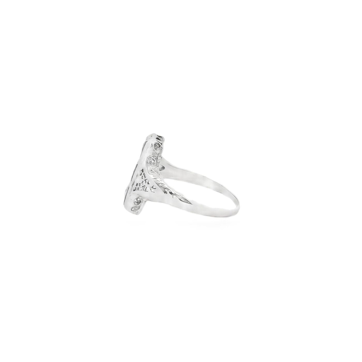This 1930s white gold ring features sparkling diamonds paired with deep blue sapphires. Art Deco filigree highlights the gemstones, creating a timeless and elegant design.
