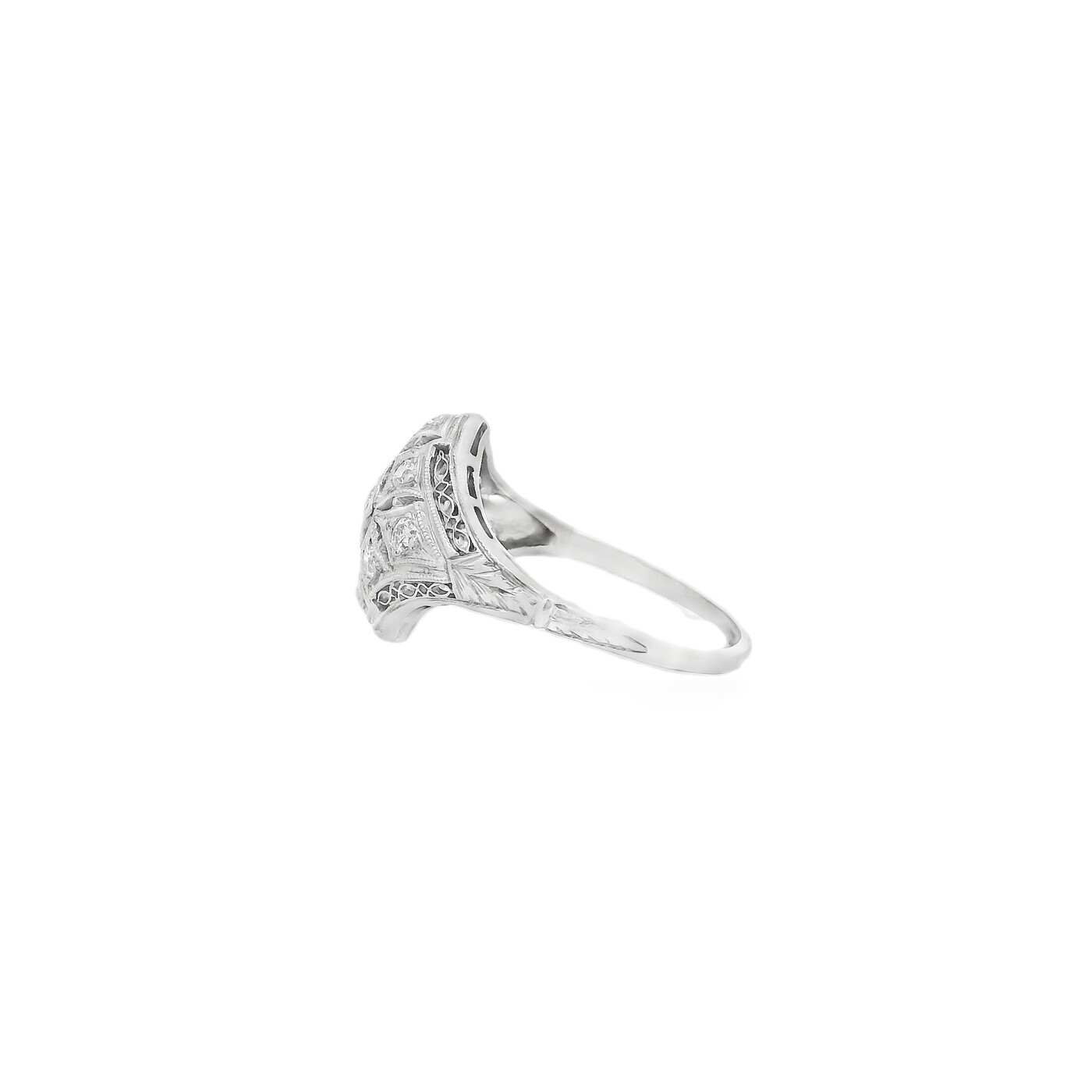 This 1930s white gold ring features sparkling diamonds set within intricate Art Deco filigree. The refined design highlights vintage elegance in a timeless, sophisticated silhouette.