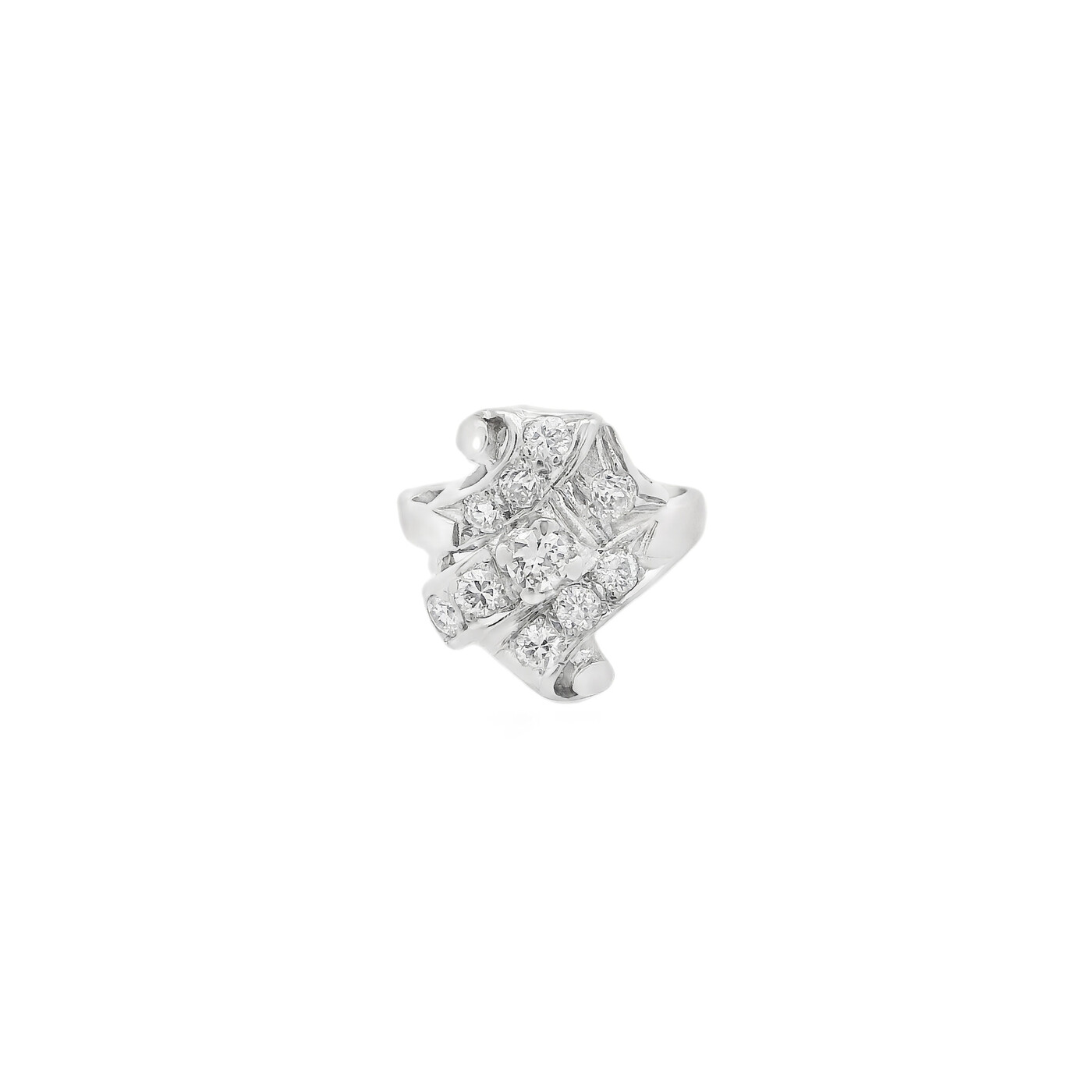 This 1950s white gold ring features sparkling diamonds set in an Art Deco scroll-inspired design. The elegant arrangement of stones highlights vintage sophistication in a timeless silhouette.