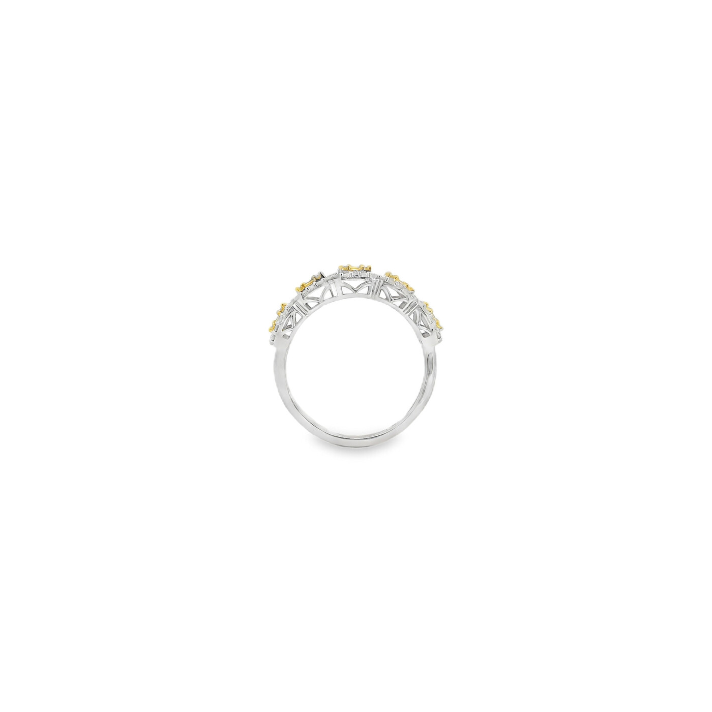 This dazzling cluster ring brings brilliant contrast with a mix of white and yellow diamonds set in polished 14K white gold. A radiant design that captures both elegance and bold sparkle.