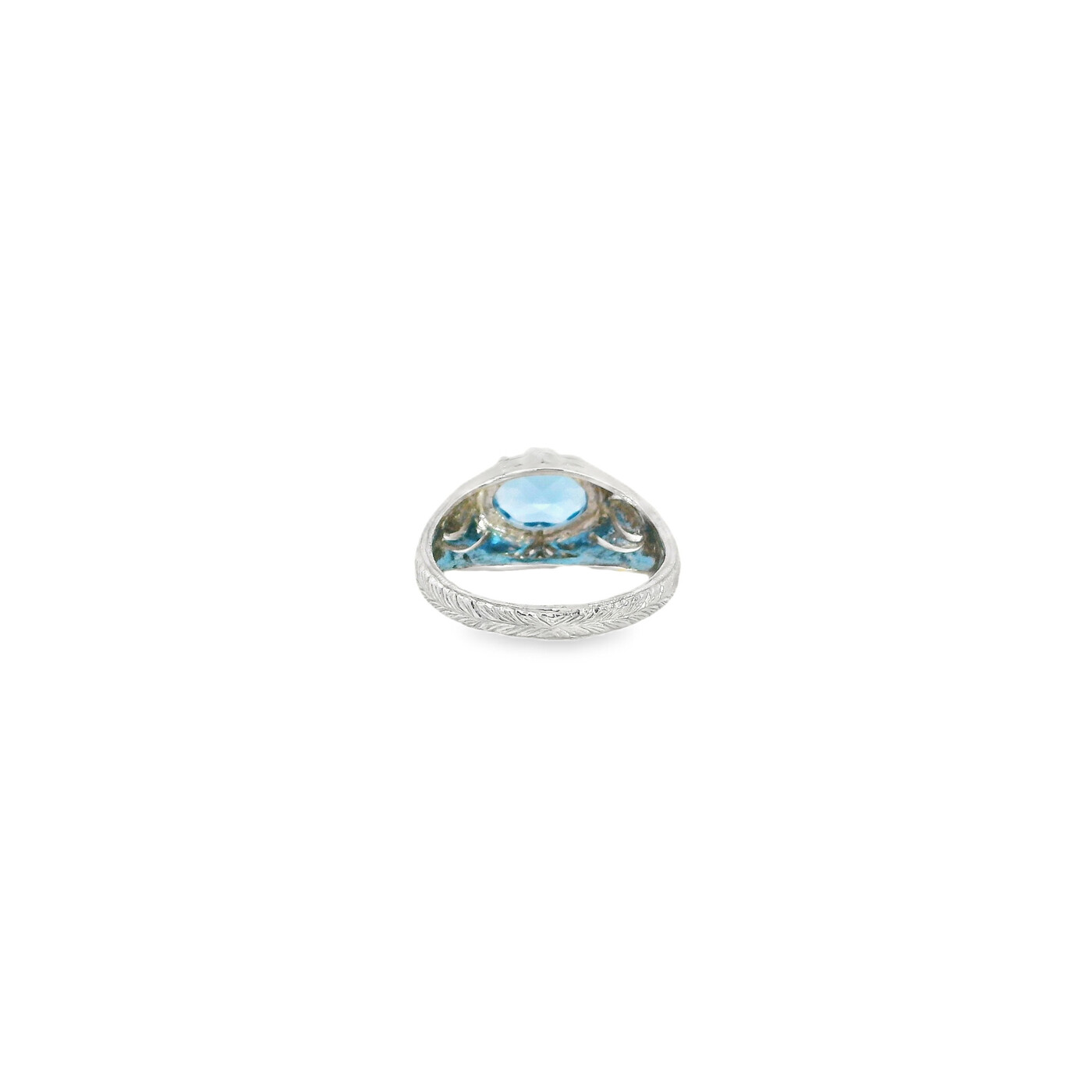 An oval blue topaz sits at the center of this 14k white gold ring, framed by intricate filigree and subtle diamond accents. Inspired by Art Deco design, the detailed metalwork adds depth and character to this distinctive piece.