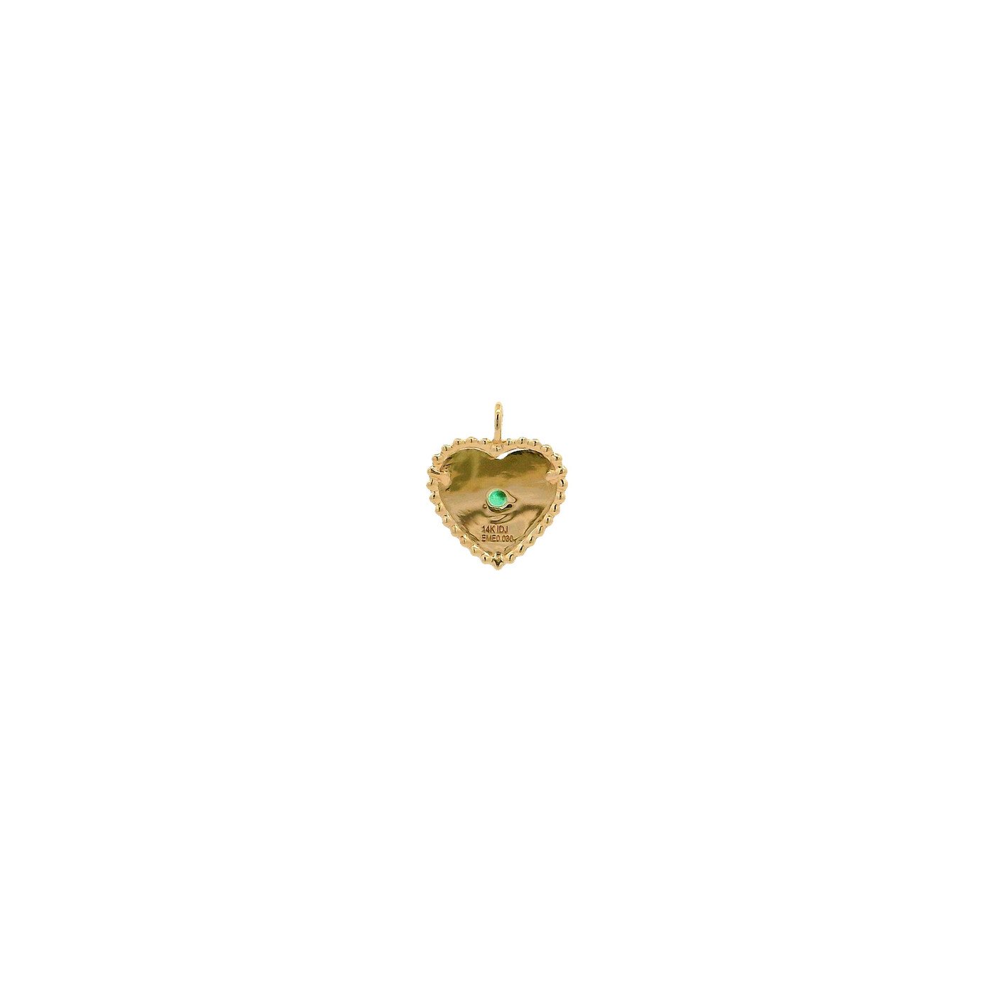 This 14k yellow gold heart pendant features a radiant emerald set in a starburst center with delicate beaded detailing. The combination of texture and color creates a meaningful, eye-catching piece perfect for everyday wear or gifting.