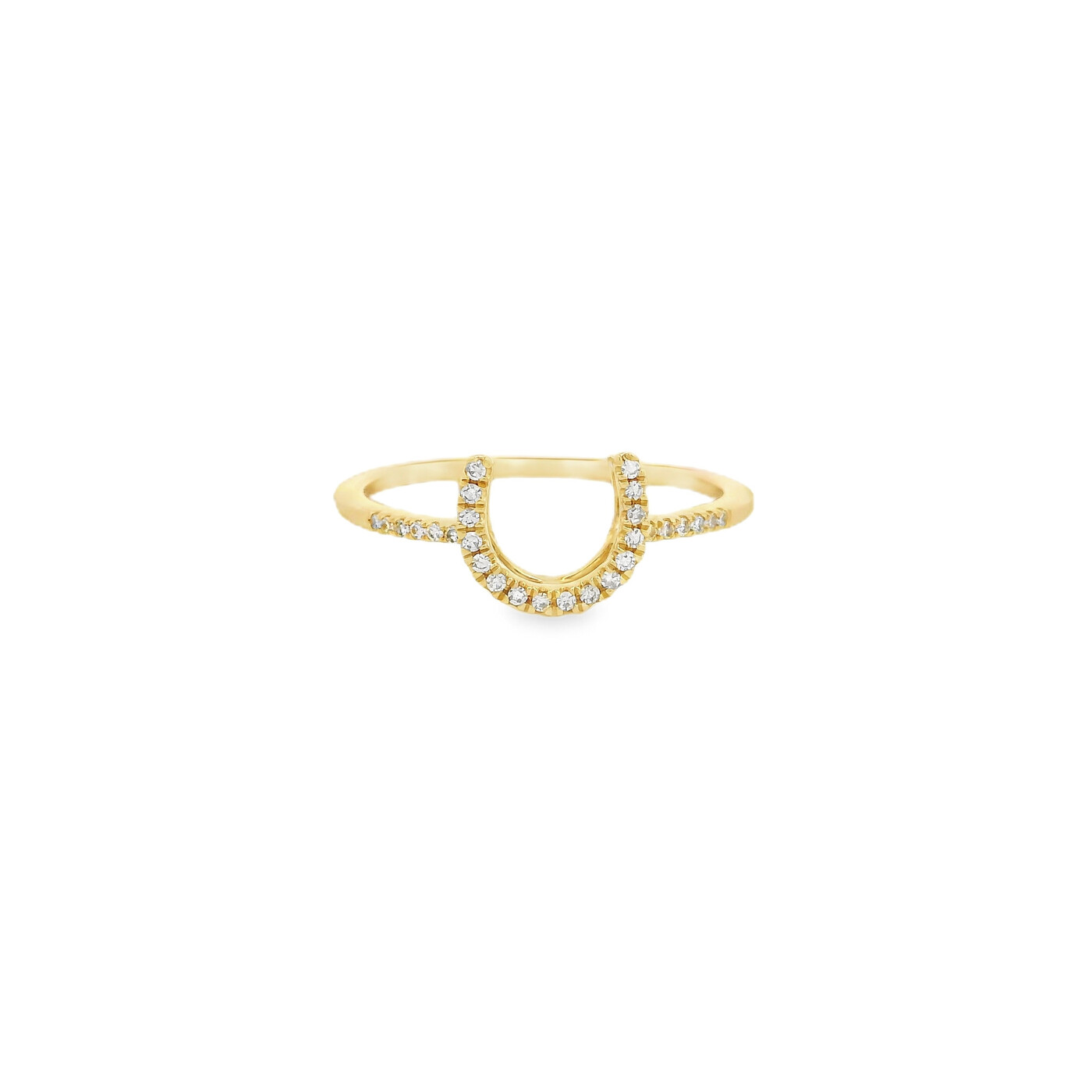 This 14K yellow gold ring features a horseshoe design accented with sparkling diamonds. Its classic shape and refined sparkle make it a timeless statement piece.