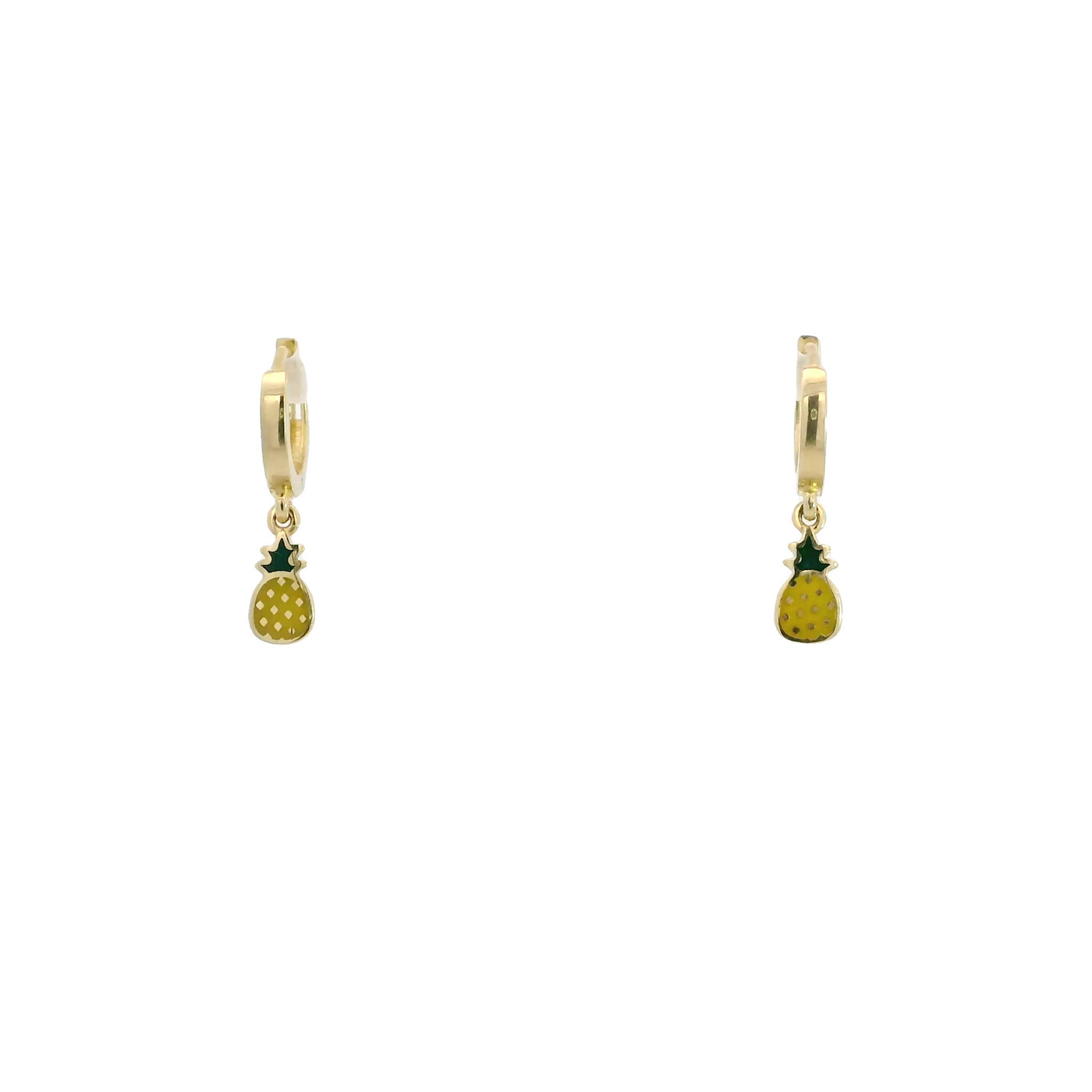 14K Yellow Gold 10x2mm Huggie Hoops with Green/Yellow Enamel Pineapple Charm