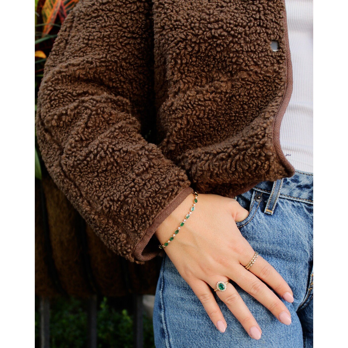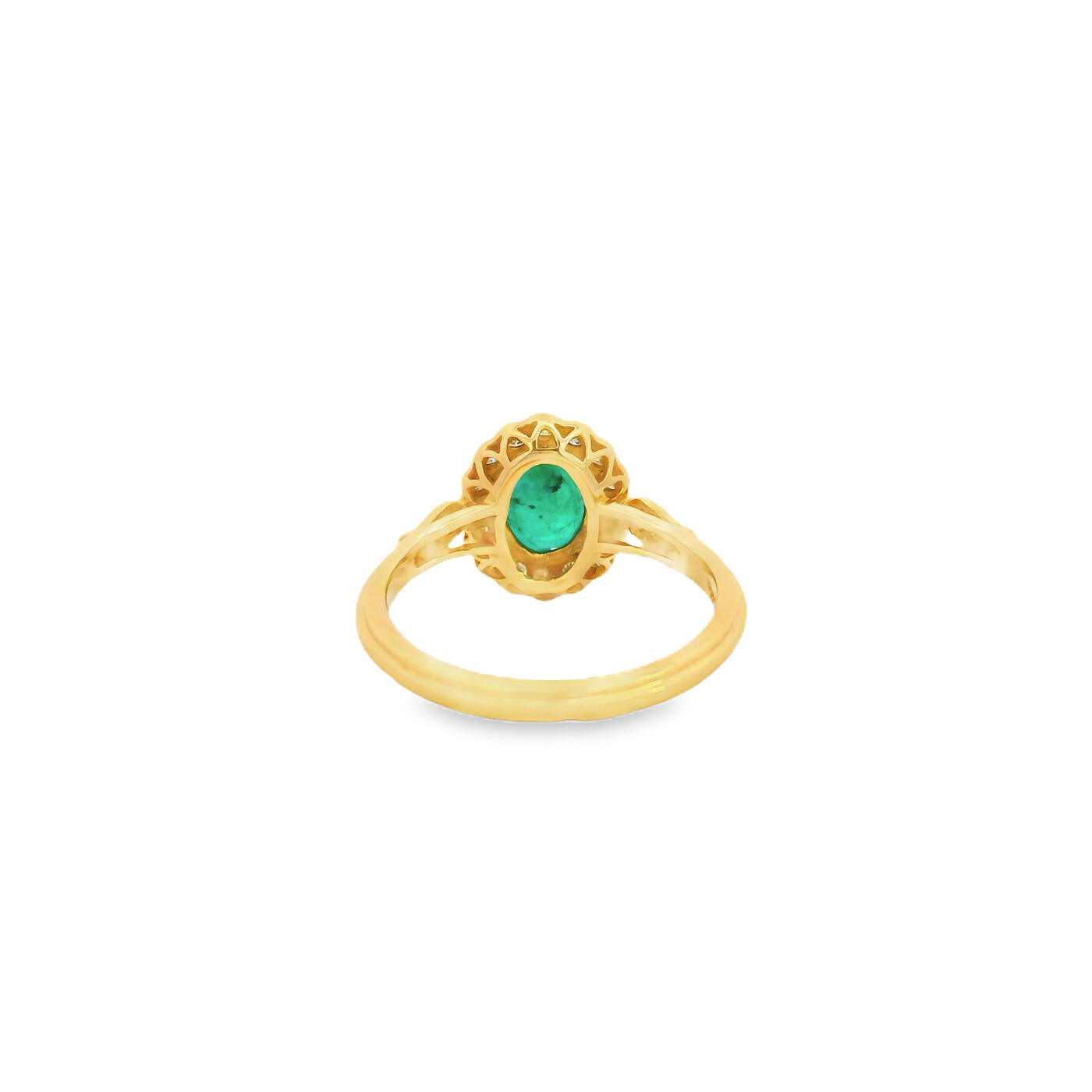 ITEM#: GCB00008348This yellow gold ring showcases a vivid oval emerald surrounded by shimmering diamonds and delicate milgrain detail. Elegant and refined, it captures timeless beauty with rich color and graceful craftsmanship.