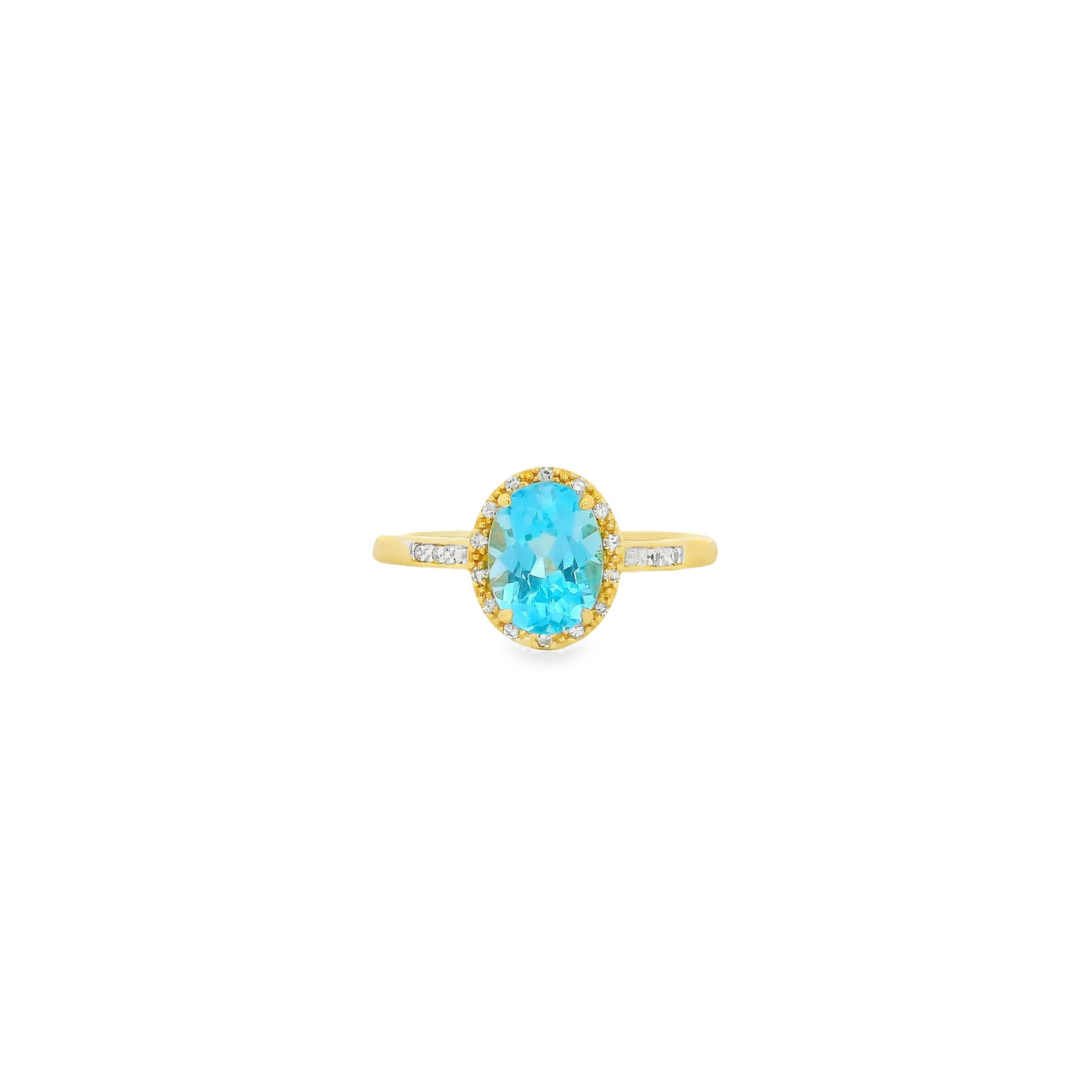 This yellow gold ring features a bright blue topaz accented by sparkling diamonds. Elegant and classic, it brings polished beauty to a timeless design.