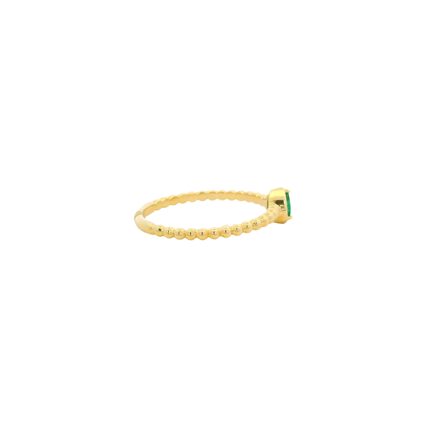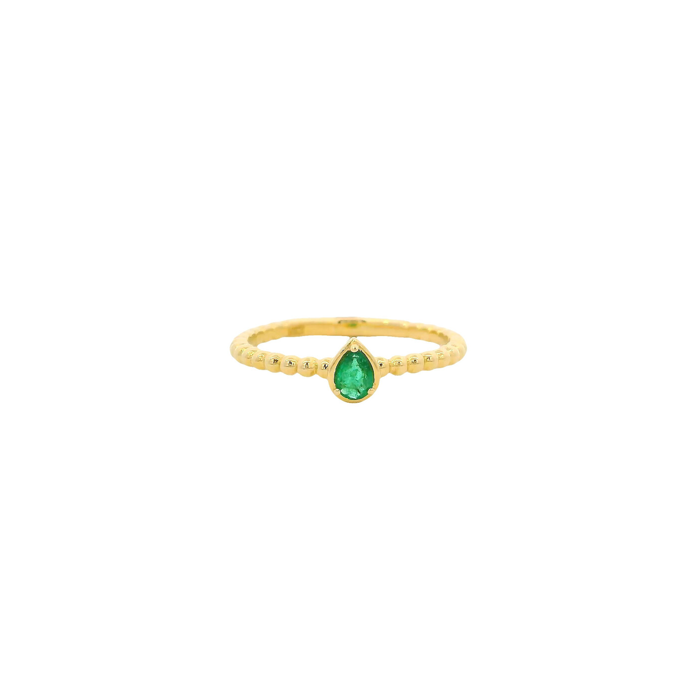 This yellow gold ring features a pear-shaped emerald set on a beaded band. Elegant and refined, it offers timeless charm with a delicate, classic design.