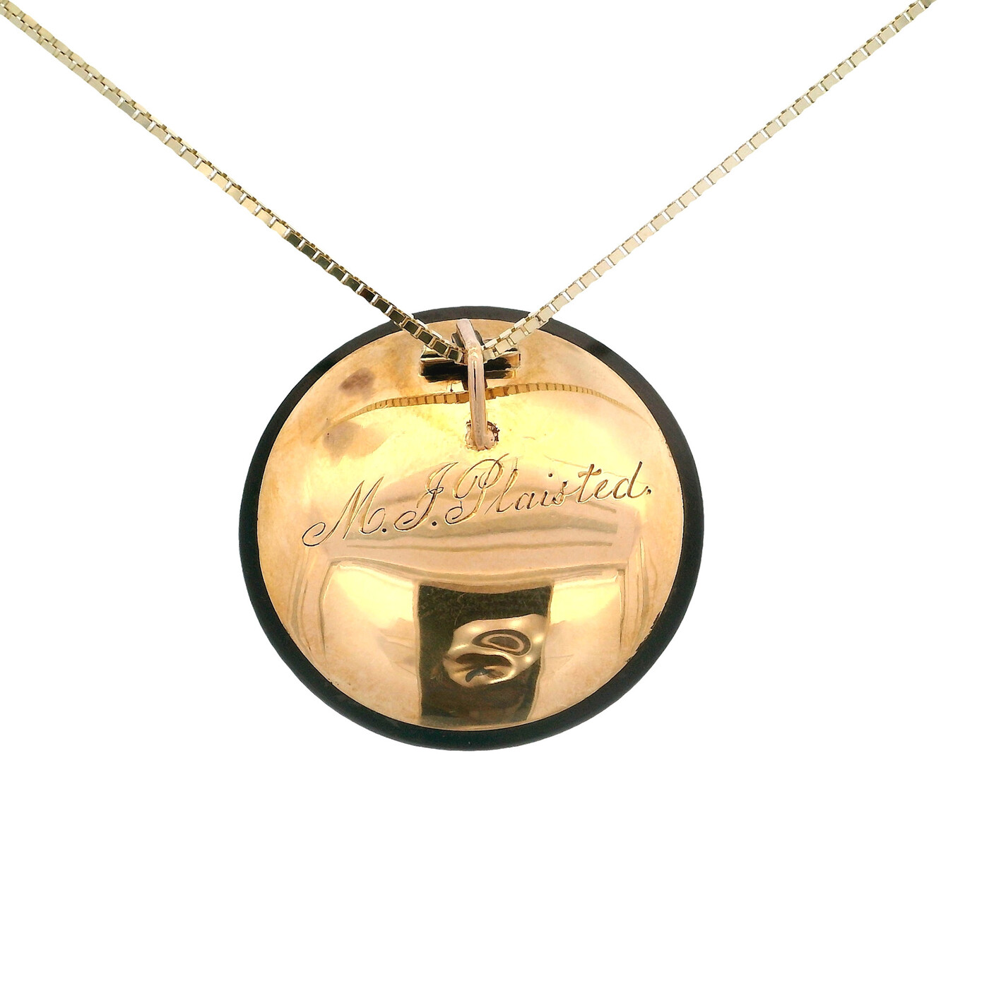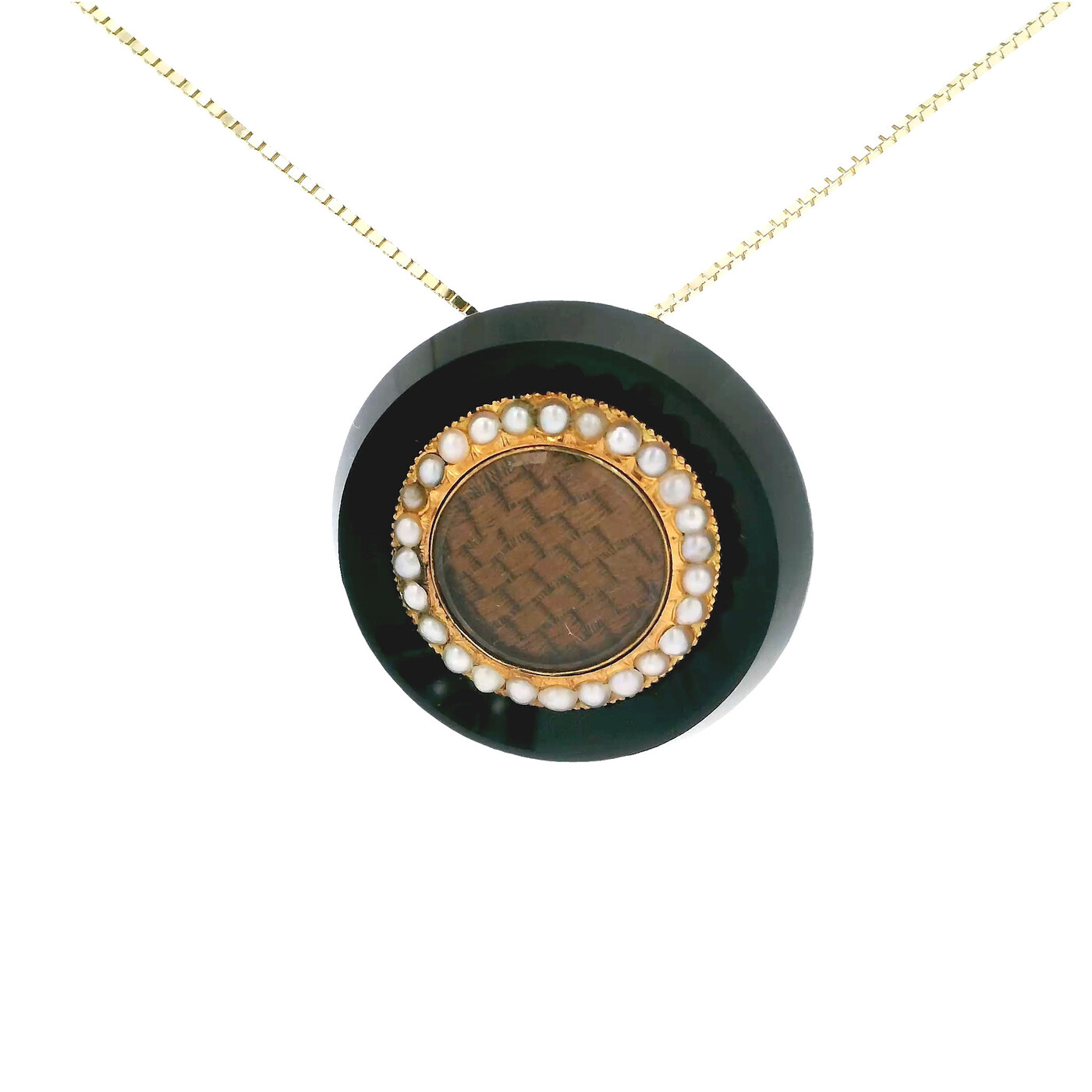 ITEM#: GCB00007273This Victorian yellow gold mourning pendant centers a polished onyx surrounded by delicate seed pearls and woven hair, capturing the era’s quiet elegance and sentimental tradition.