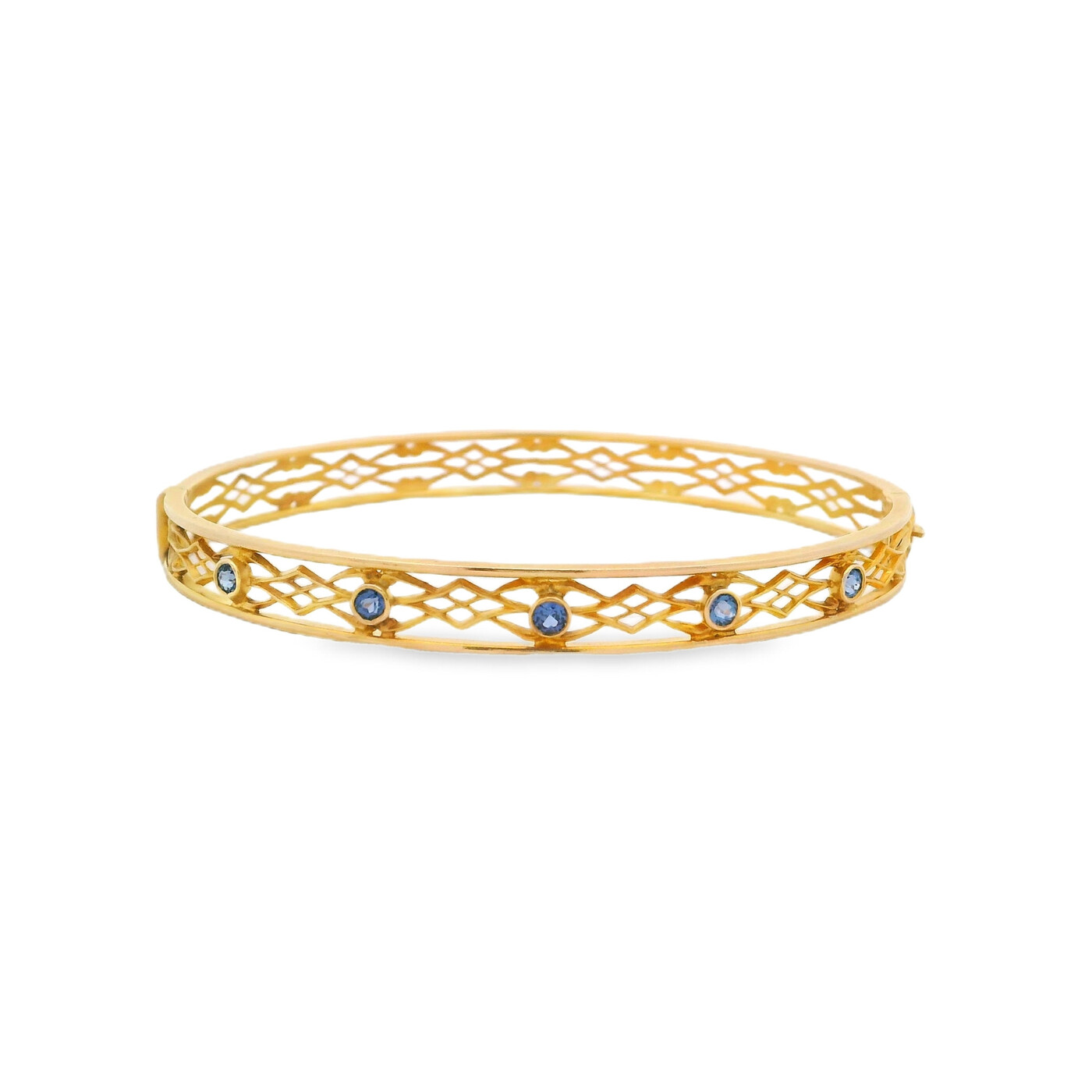 Stones: (5) Round Cut Blue Sapphires weighing .45 Carats Hinged Bangle