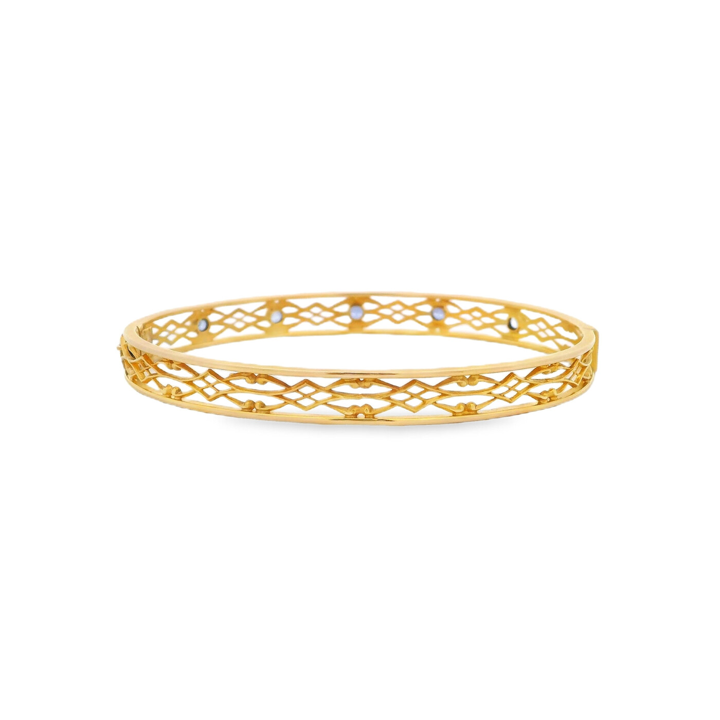 This 1920s bangle features a refined sapphire framed by intricate filigree in 14K yellow gold. The detailed craftsmanship reflects the elegance of the era.