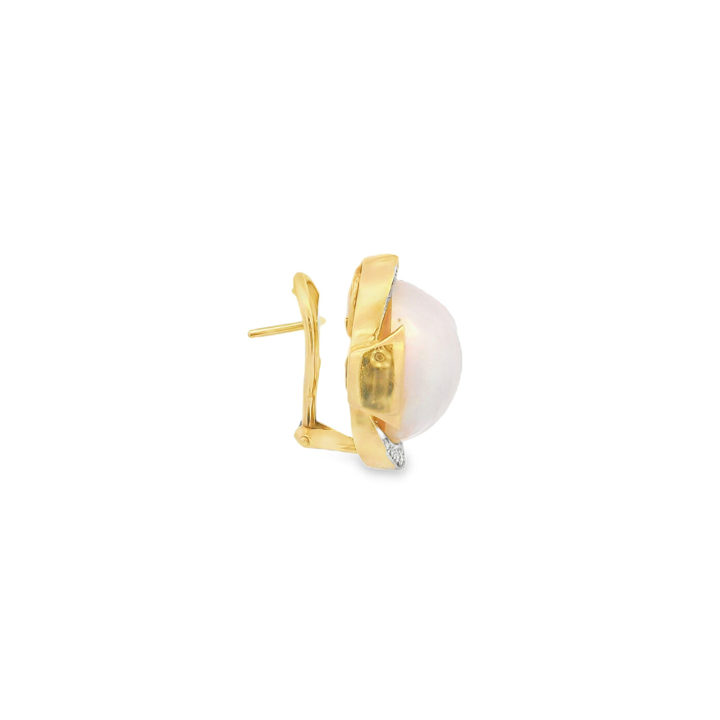 Luminous mabe pearls rest in 14K yellow gold settings accented by diamonds. This 1970s design pairs bold scale with classic elegance.