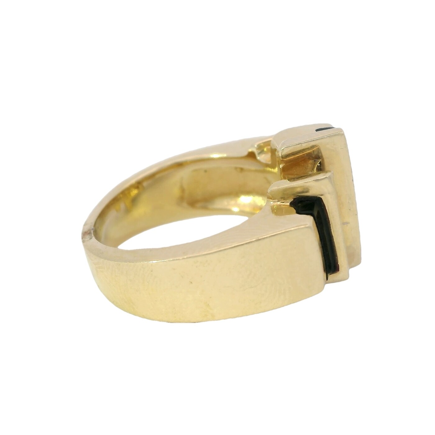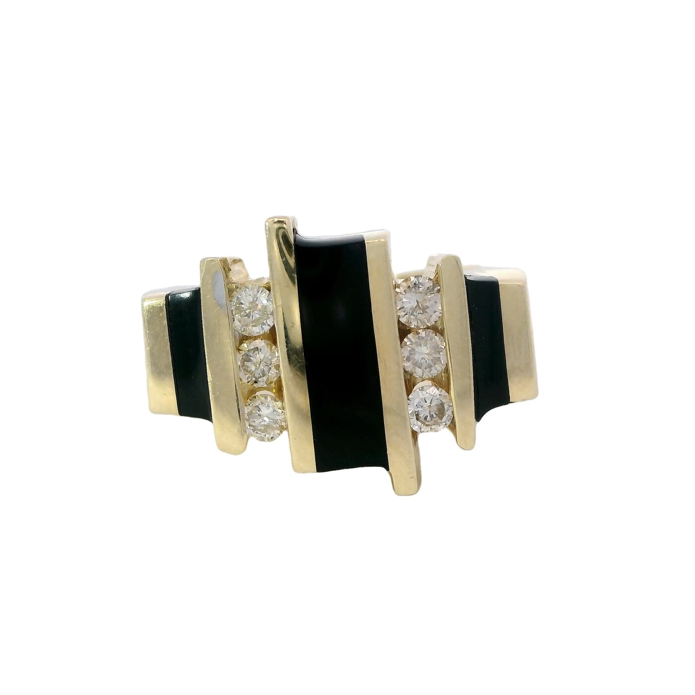 ITEM#: GCB00008054This 1970s ring features alternating panels of black onyx and diamonds set in 14K yellow gold. With its bold geometry and vertical symmetry, it channels Art Deco inspiration in a striking vintage design.