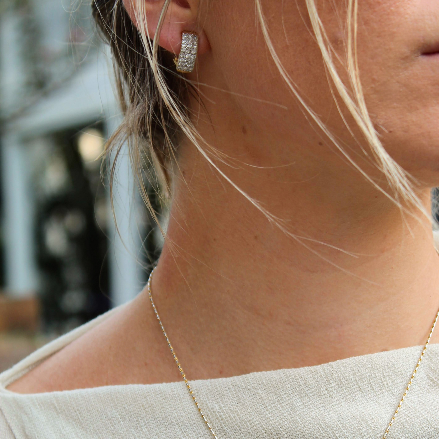 14K Yellow & White Gold 1980's Triple Row Diamond Huggie Hoops with Brilliant Round Cut Diamonds equaling 1 Carat F-G Color SI1 Clarity and Omega Backings