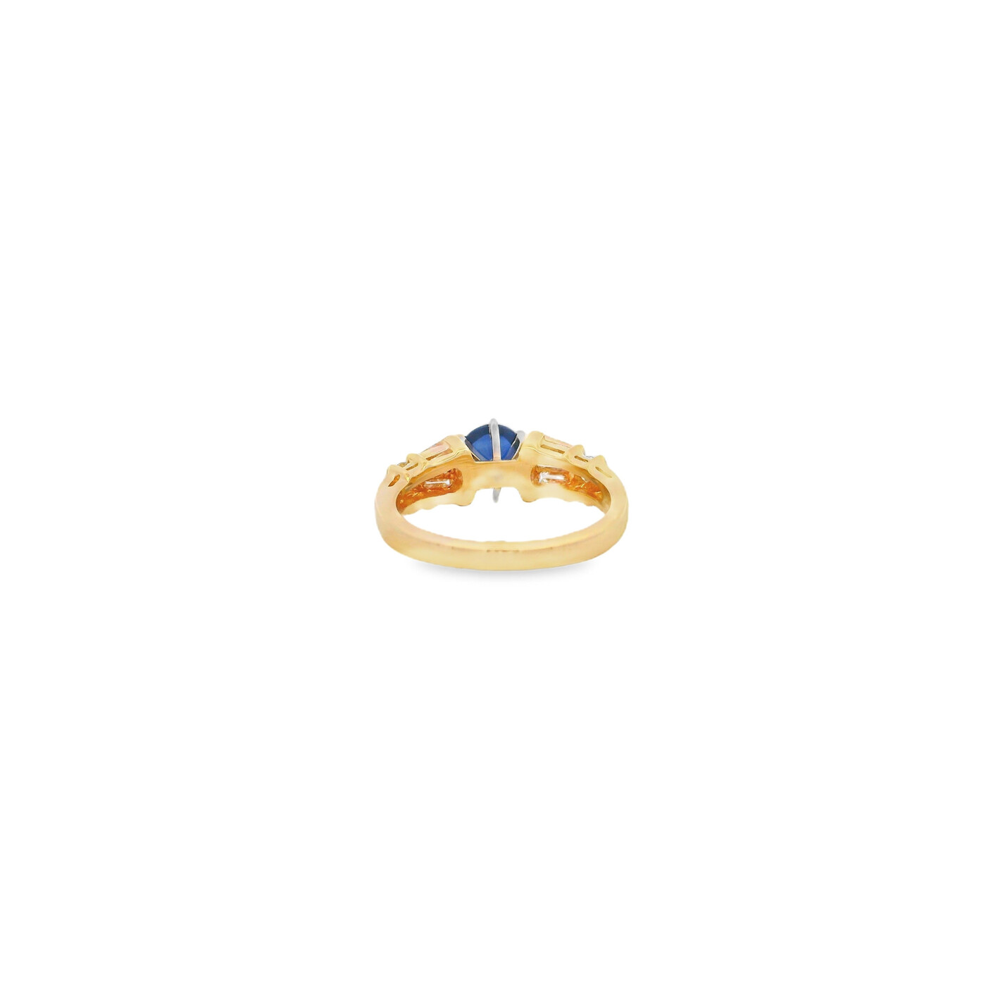 This yellow gold ring features a deep blue sapphire framed by baguette diamonds that give it a bright, balanced look. It’s great for adding a rich touch of color to your everyday style and brings a classic, polished feel to any collection.