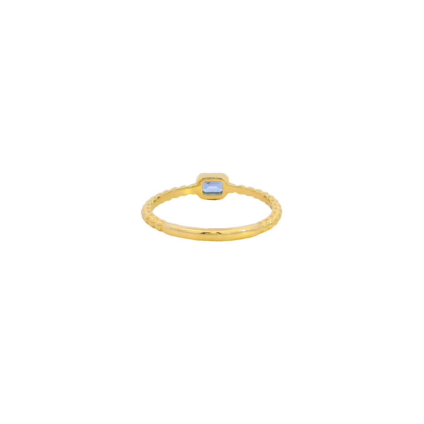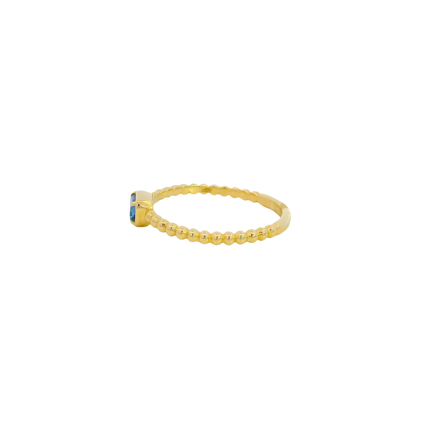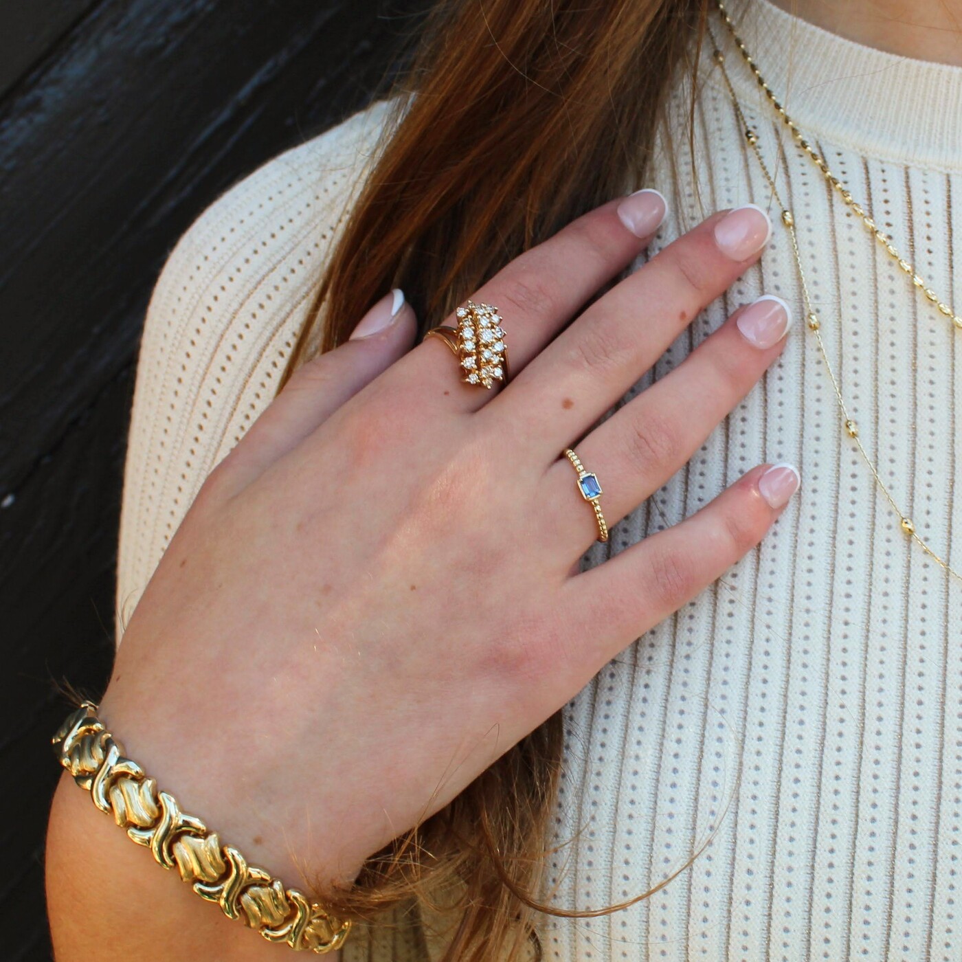 This ring highlights an emerald cut sapphire set east to west in yellow gold with beaded detail. Refined and distinctive, it adds timeless elegance to any collection.