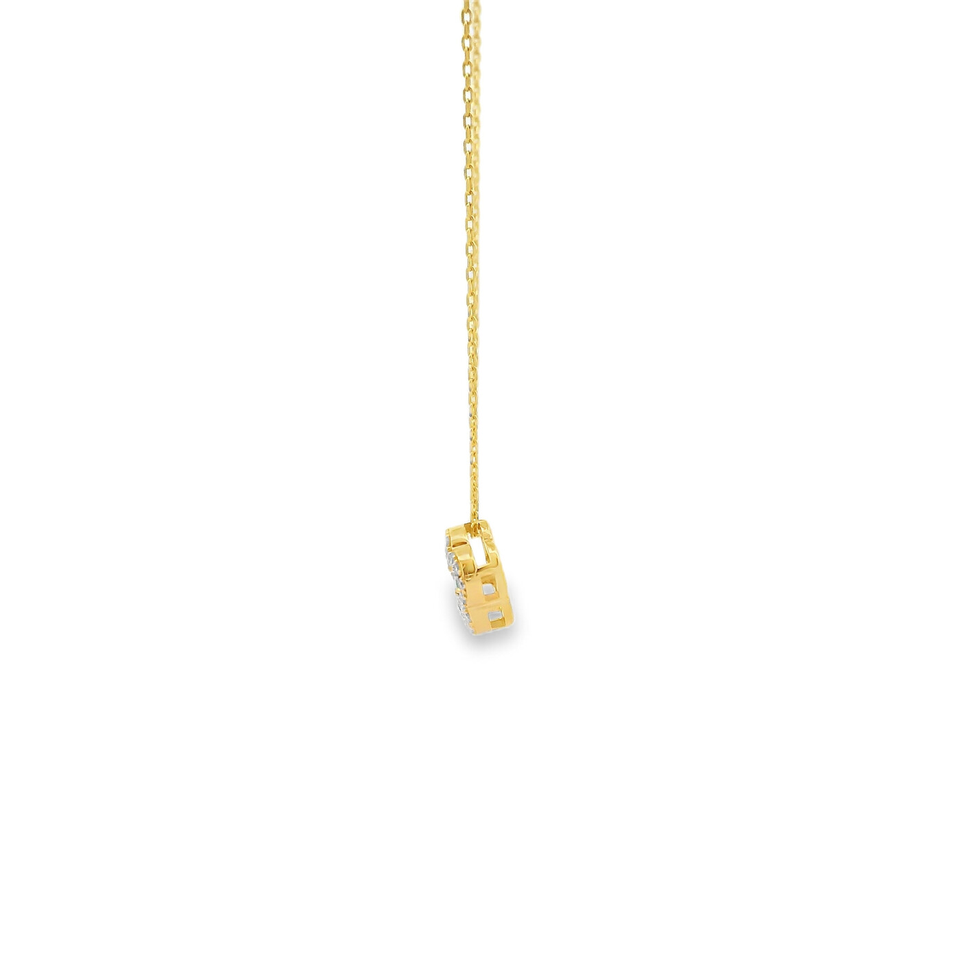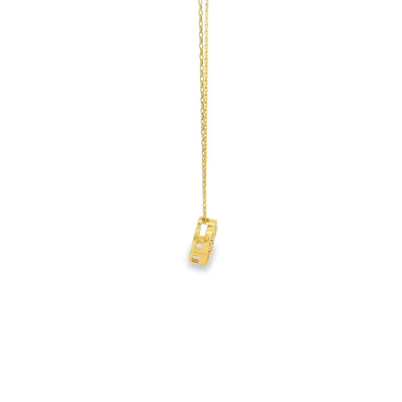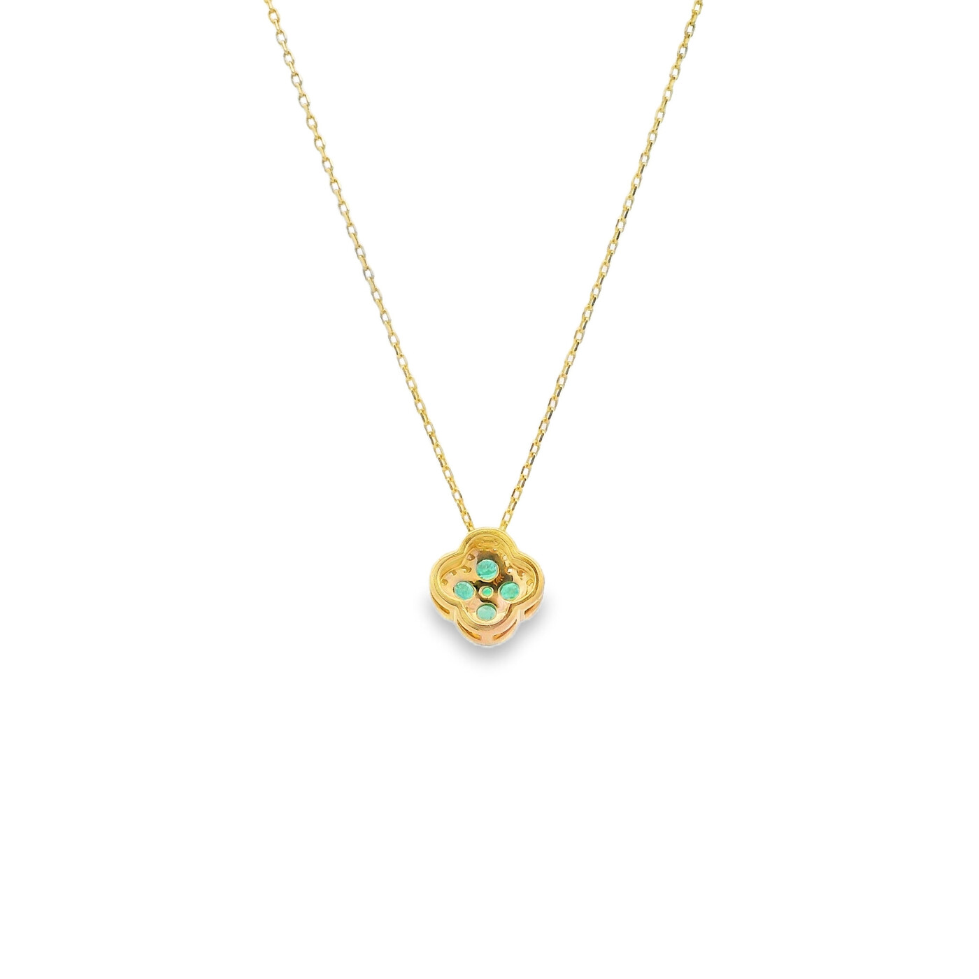 This yellow gold necklace features a bright cluster of green emeralds framed by a soft halo of diamonds. It’s great for adding a colorful touch to your everyday style and brings a graceful, eye catching sparkle to any look.