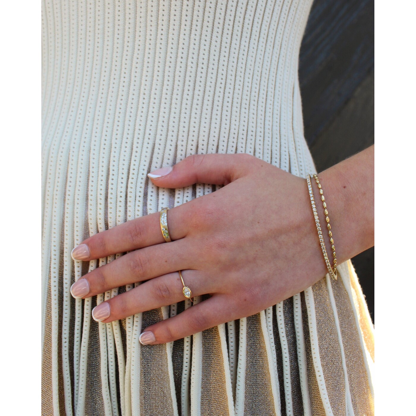 This yellow gold band showcases gypsy set diamonds set flush within its brushed surface, creating a clean and timeless look. Its softly rounded design adds an elegant touch to a classic style.