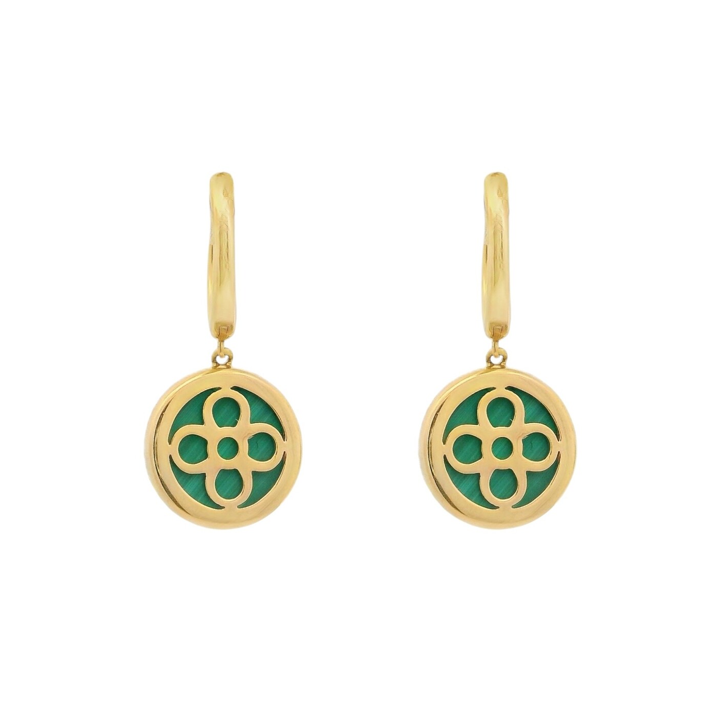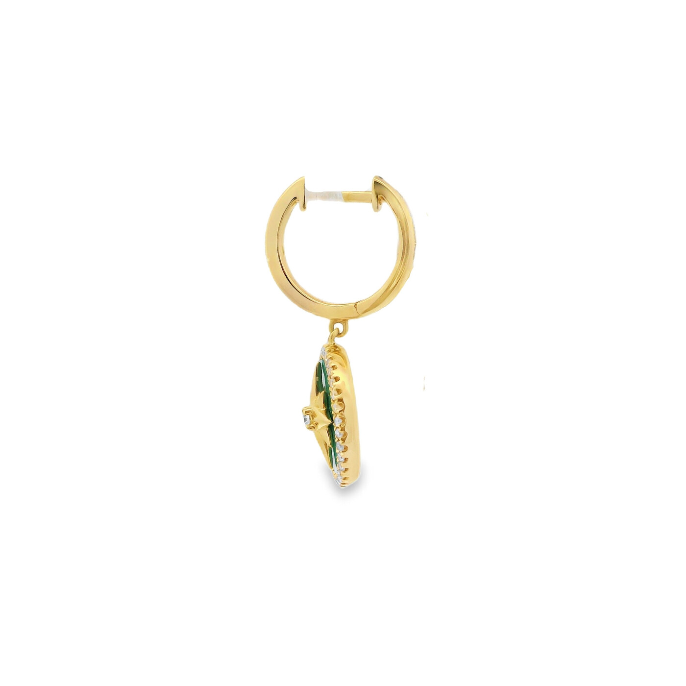 ITEM#: GCB00009379These yellow gold huggie hoops feature a compass rose accented with diamonds and malachite. The design captures refined elegance and subtle symbolism with luminous contrast and graceful form.