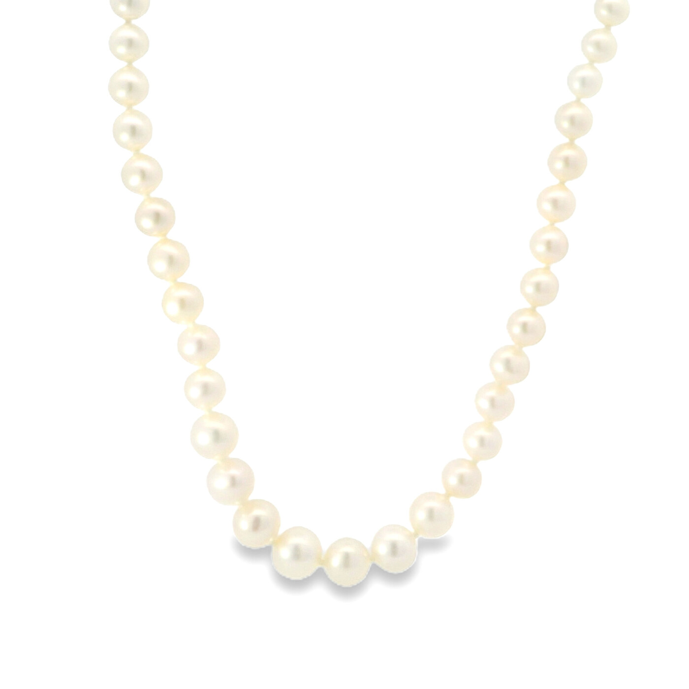 This yellow gold necklace features white freshwater pearls in a graduated strand from 4 to 8 millimeters. Its classic design and luminous pearls bring timeless elegance to any collection.