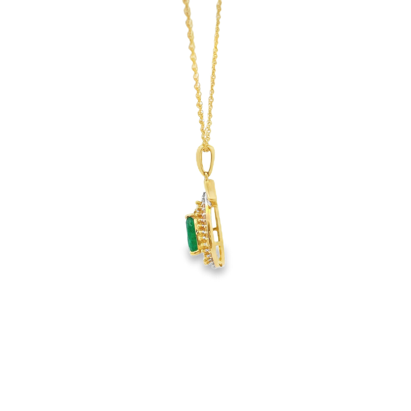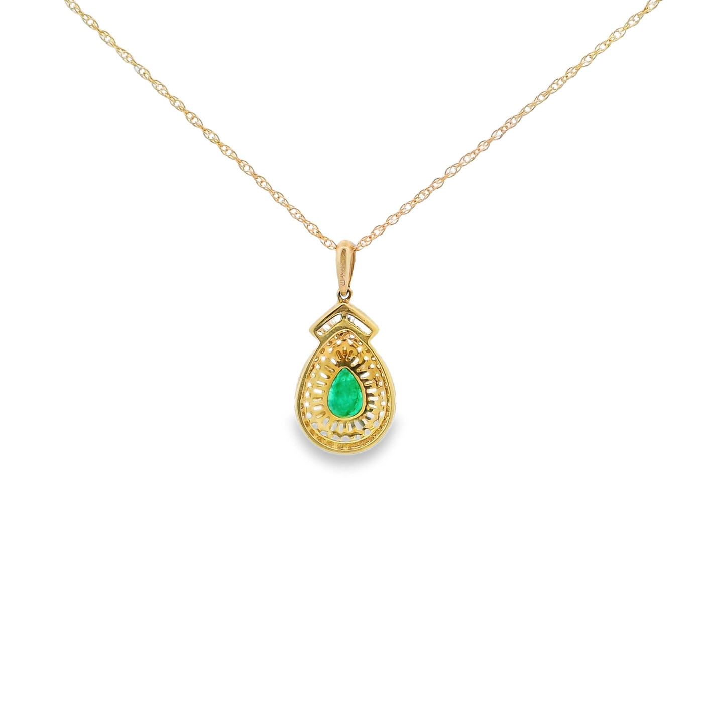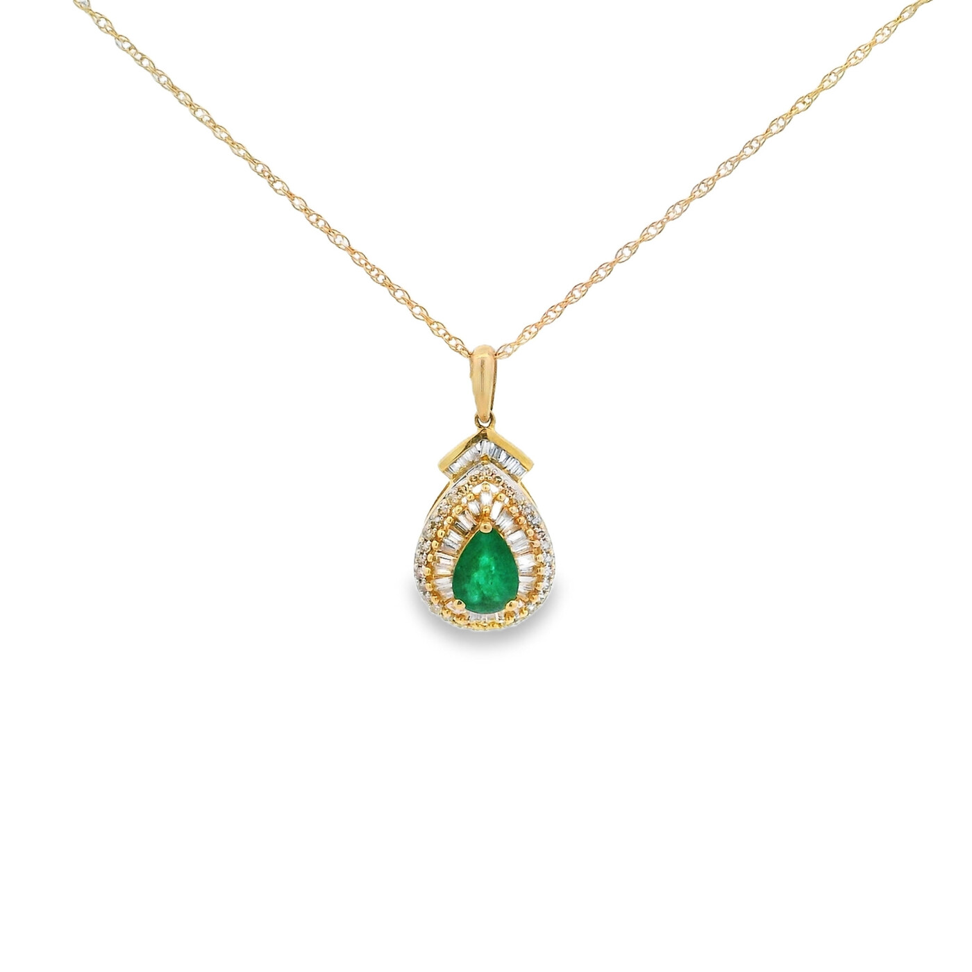 A pear-shaped emerald glows with vivid color, accented by sparkling diamonds in this 14K yellow gold necklace. The polished setting enhances its brilliance, creating a timeless design with graceful charm.