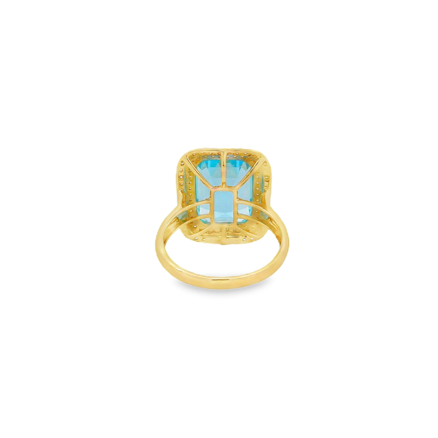 ITEM#: GCB00009367This yellow gold ring showcases an emerald-cut sky blue topaz accented by diamonds. The elegant setting emphasizes the gemstone’s vibrant hue, creating a refined and timeless design.