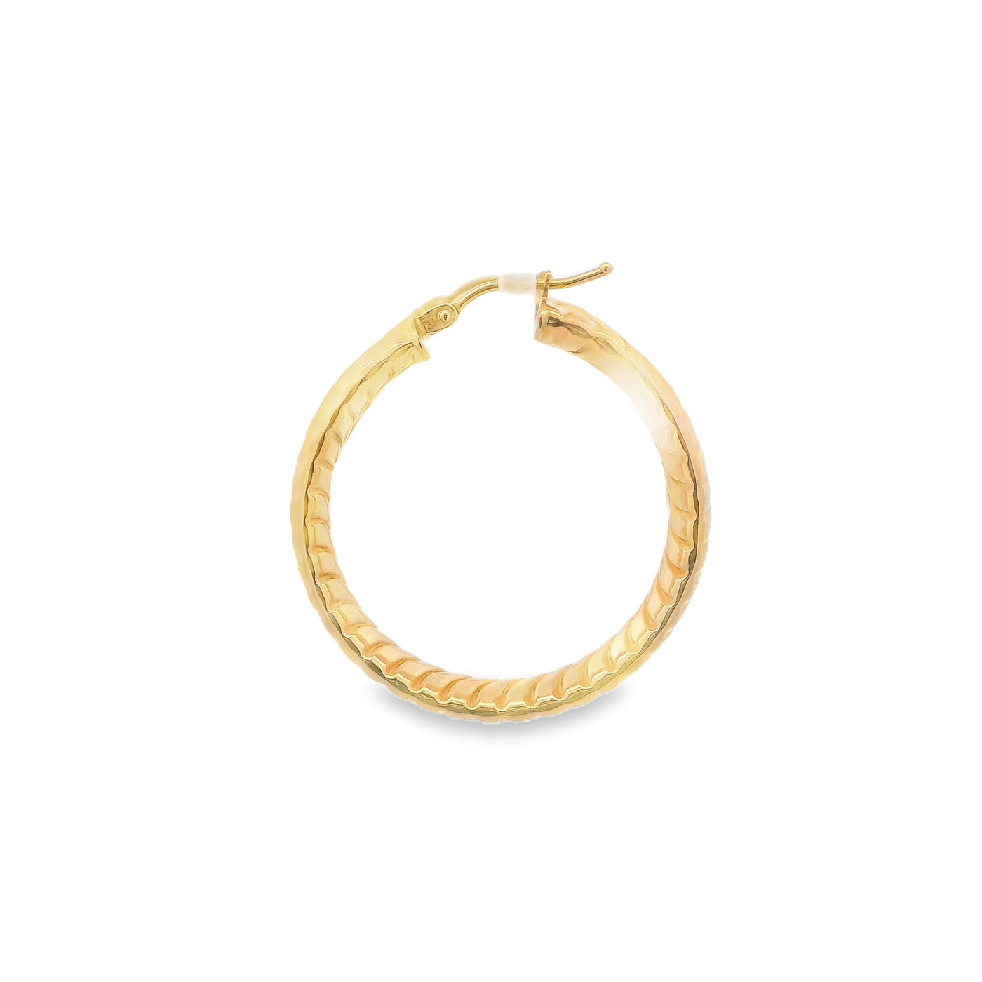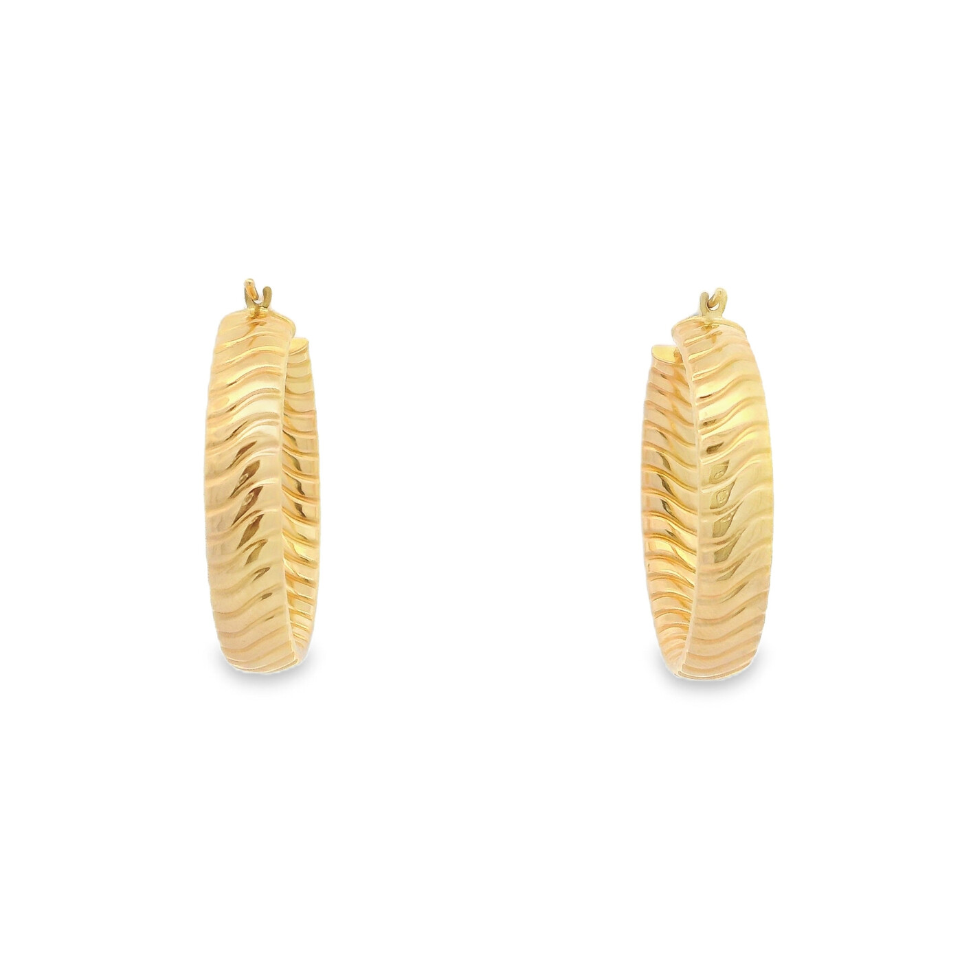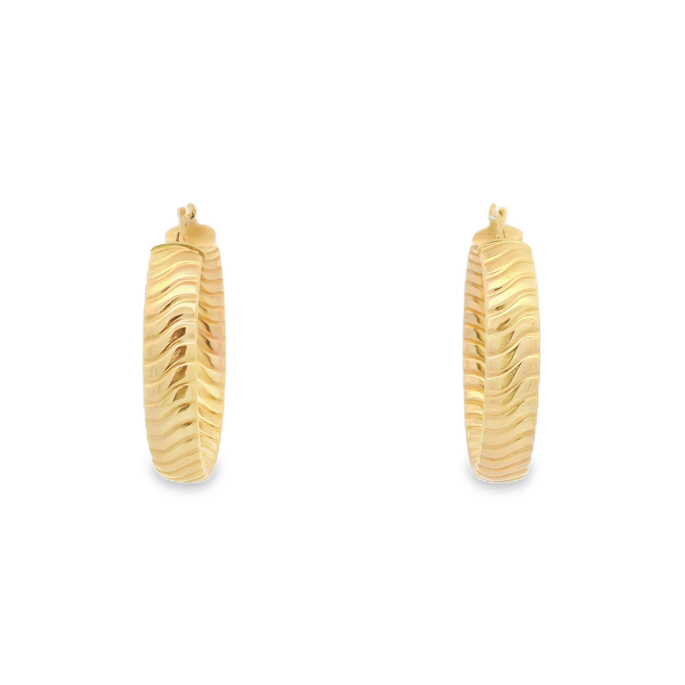 ITEM#: GCB00009398These estate yellow gold hoops feature a textured finish that adds depth and shine. Elegant and timeless, they bring refined sophistication to any collection.