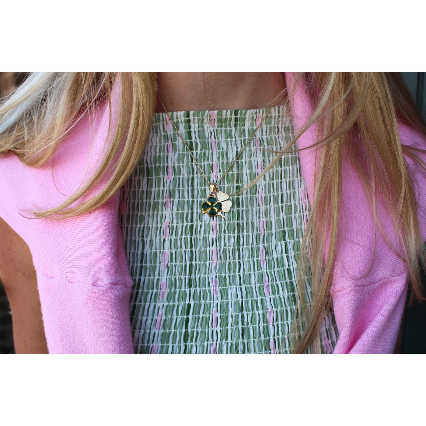 This estate charm features a simple four-leaf clover filled with rich green enamel, bordered by warm 14K yellow gold. Its classic design offers a subtle touch of luck and timeless elegance.