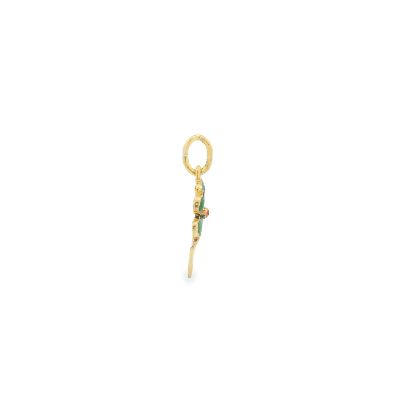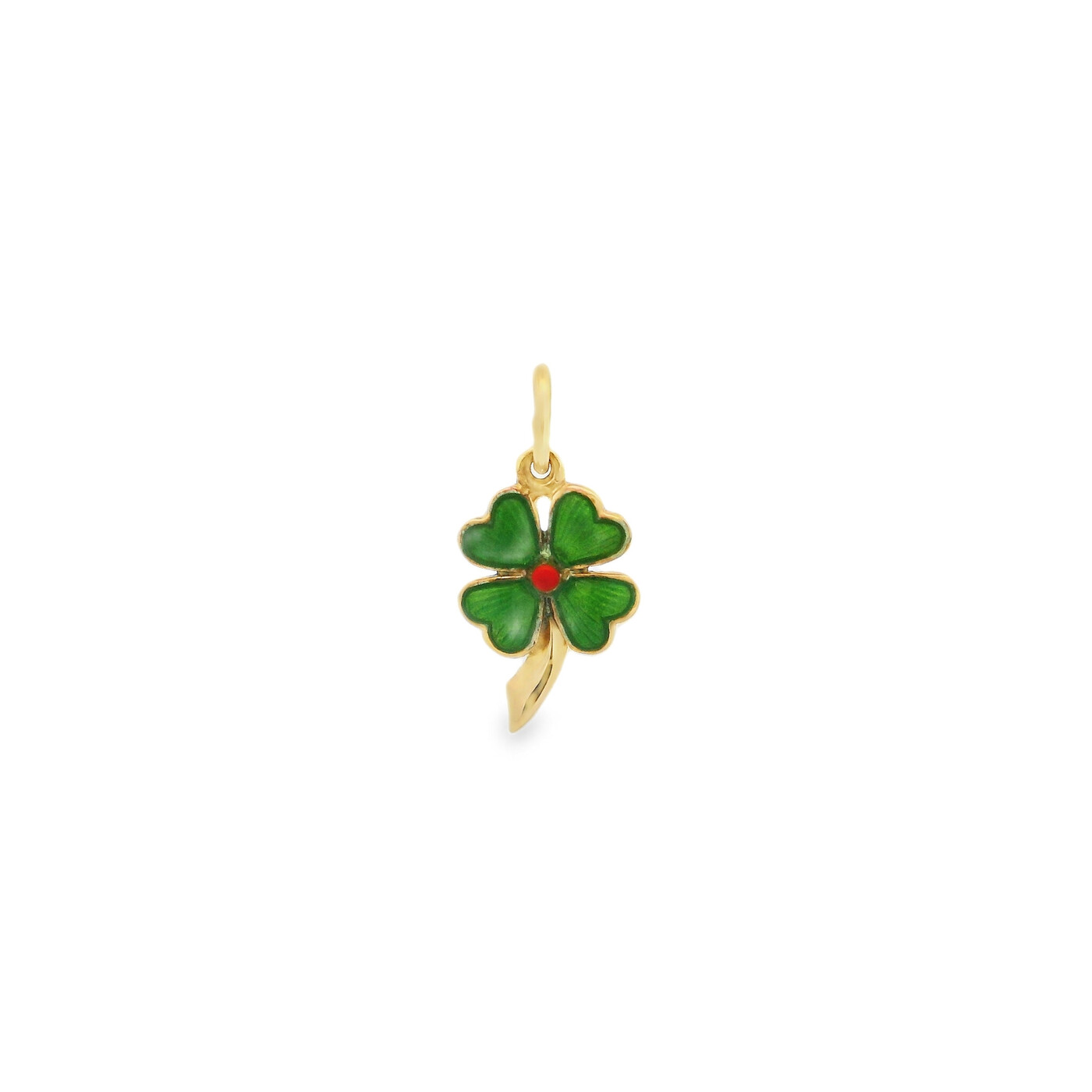 This estate yellow gold charm features a four-leaf clover in green and red enamel. The polished design brings a timeless touch of color and luck to any collection.