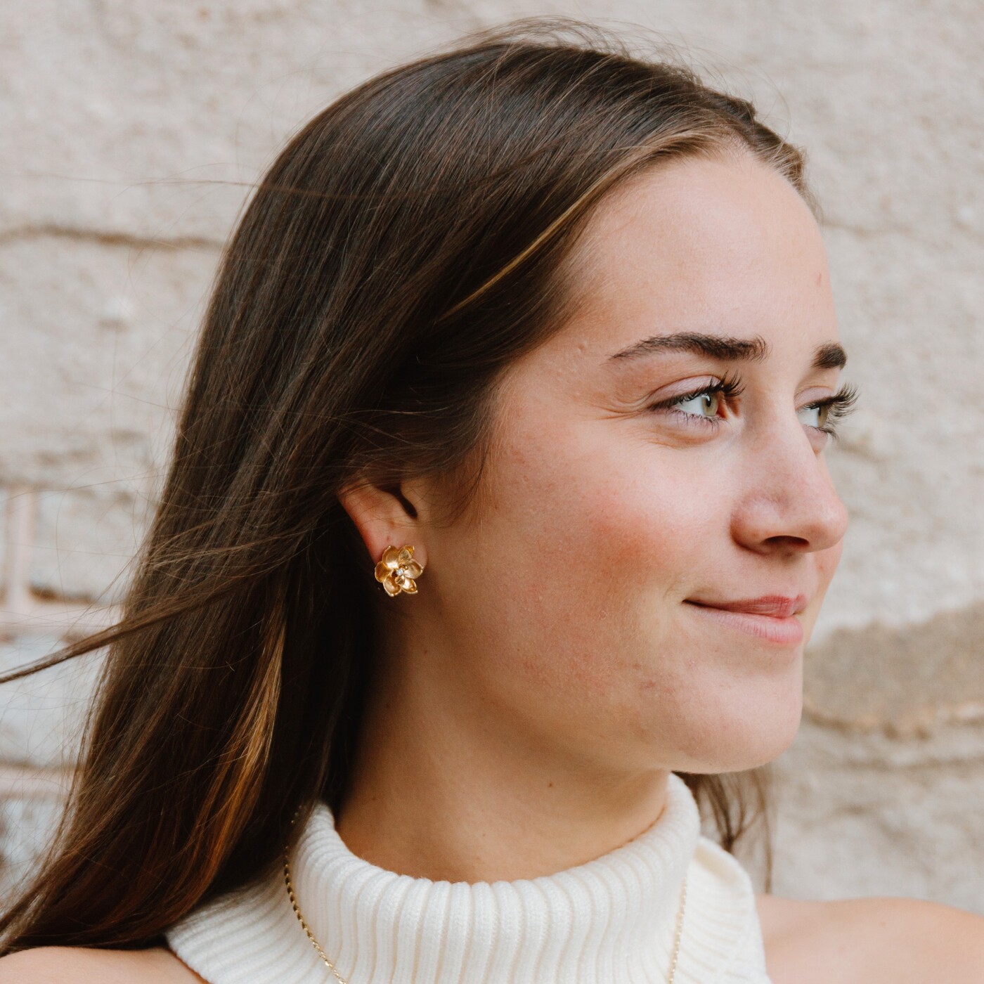 These yellow gold earrings showcase polished and brushed magnolia petals accented by a sparkling lab-grown diamond. An original Gold Creations Flowers of Charleston design, they blend timeless Southern beauty with refined elegance.