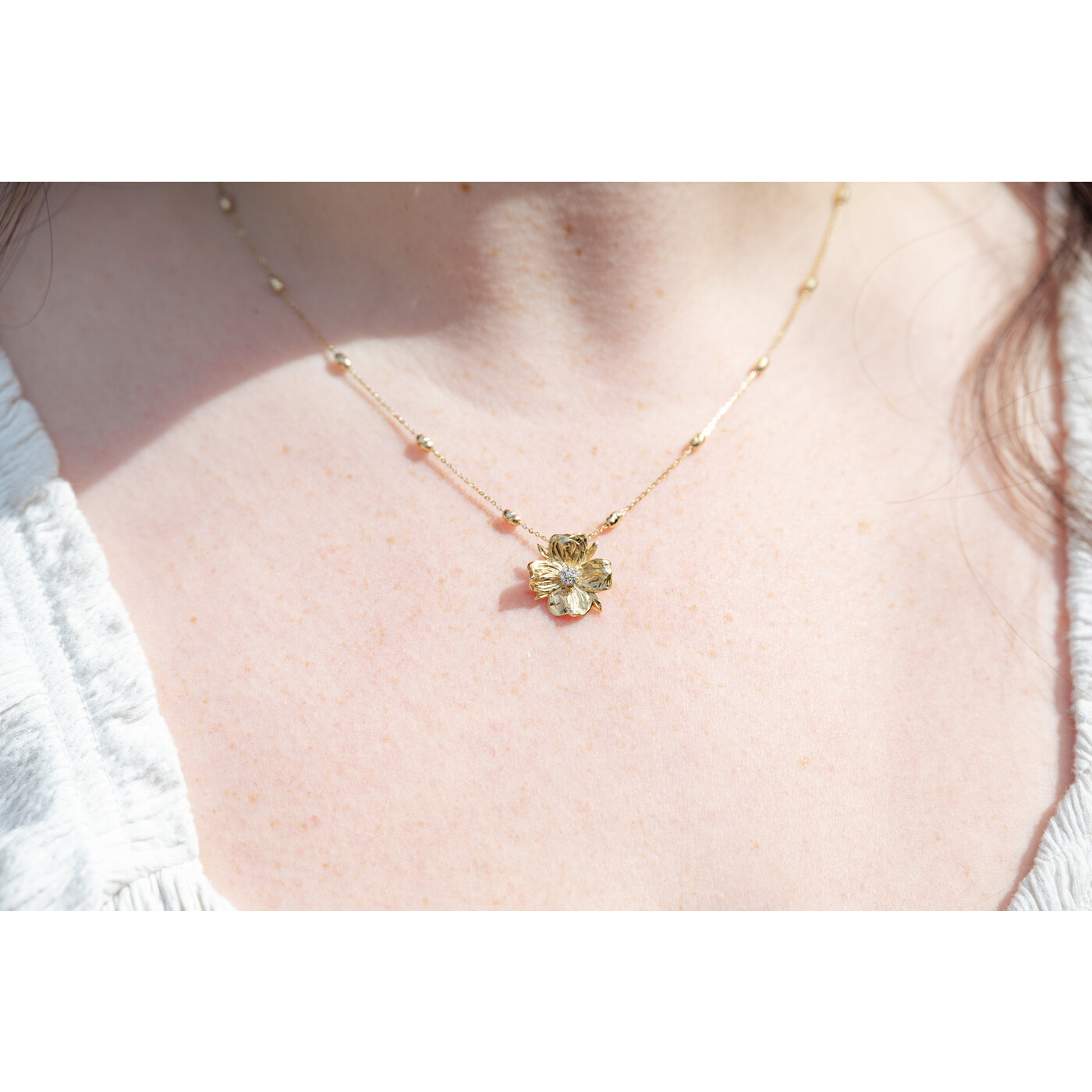 ITEM#: GCB00007660This yellow gold pendant features textured dogwood petals accented by a sparkling lab-grown diamond. An original Gold Creations Flowers of Charleston design, it blends timeless Southern beauty with refined elegance.