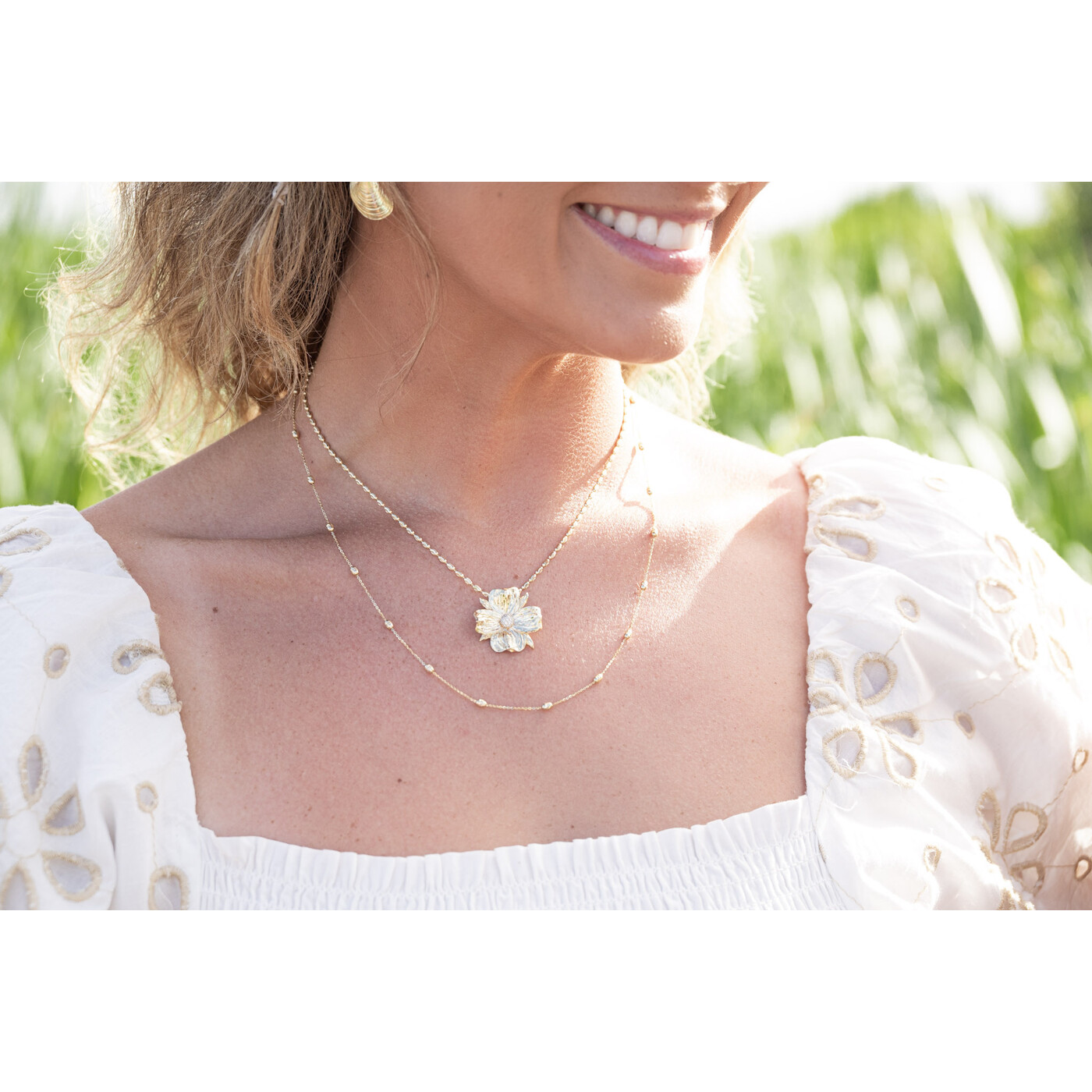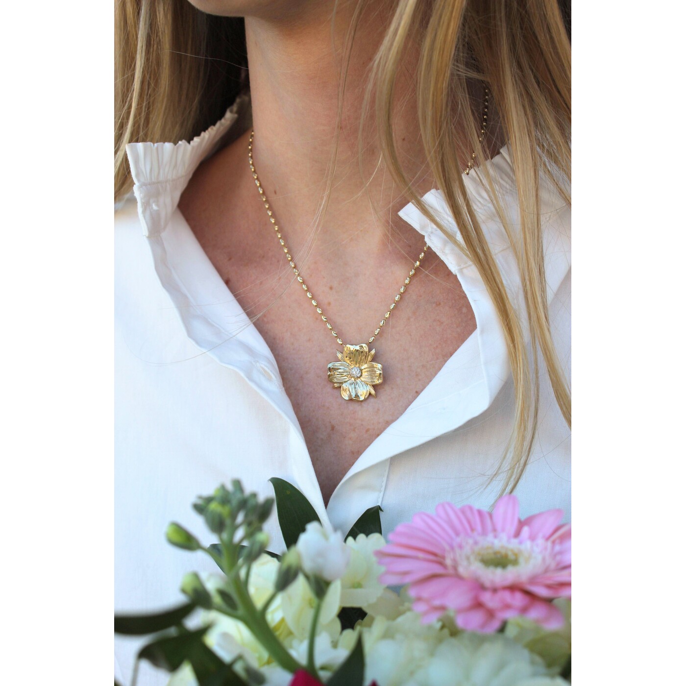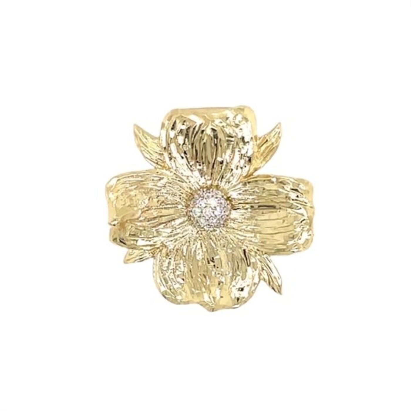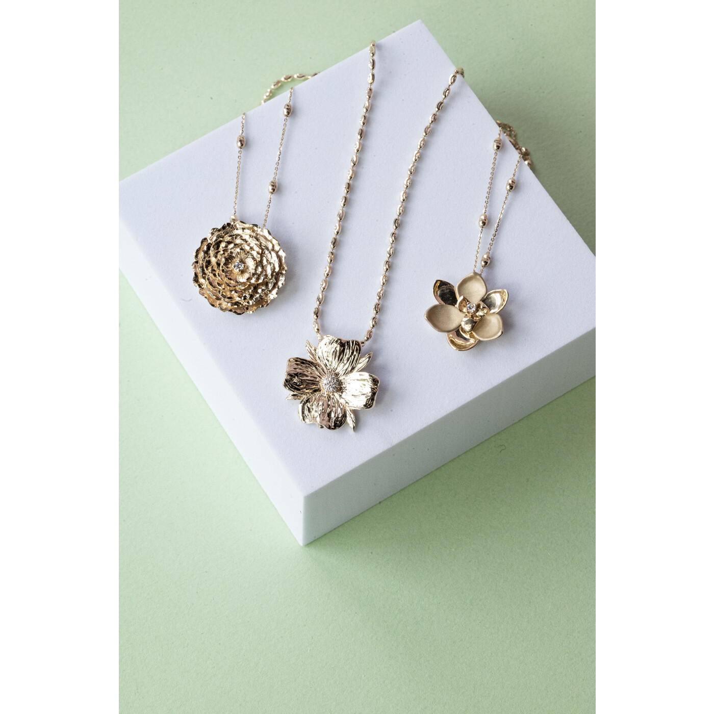 ITEM#: GCB00006977This yellow gold pendant features textured dogwood petals accented by a sparkling lab-grown diamond. An original Gold Creations Flowers of Charleston design, it blends timeless Southern beauty with refined elegance.