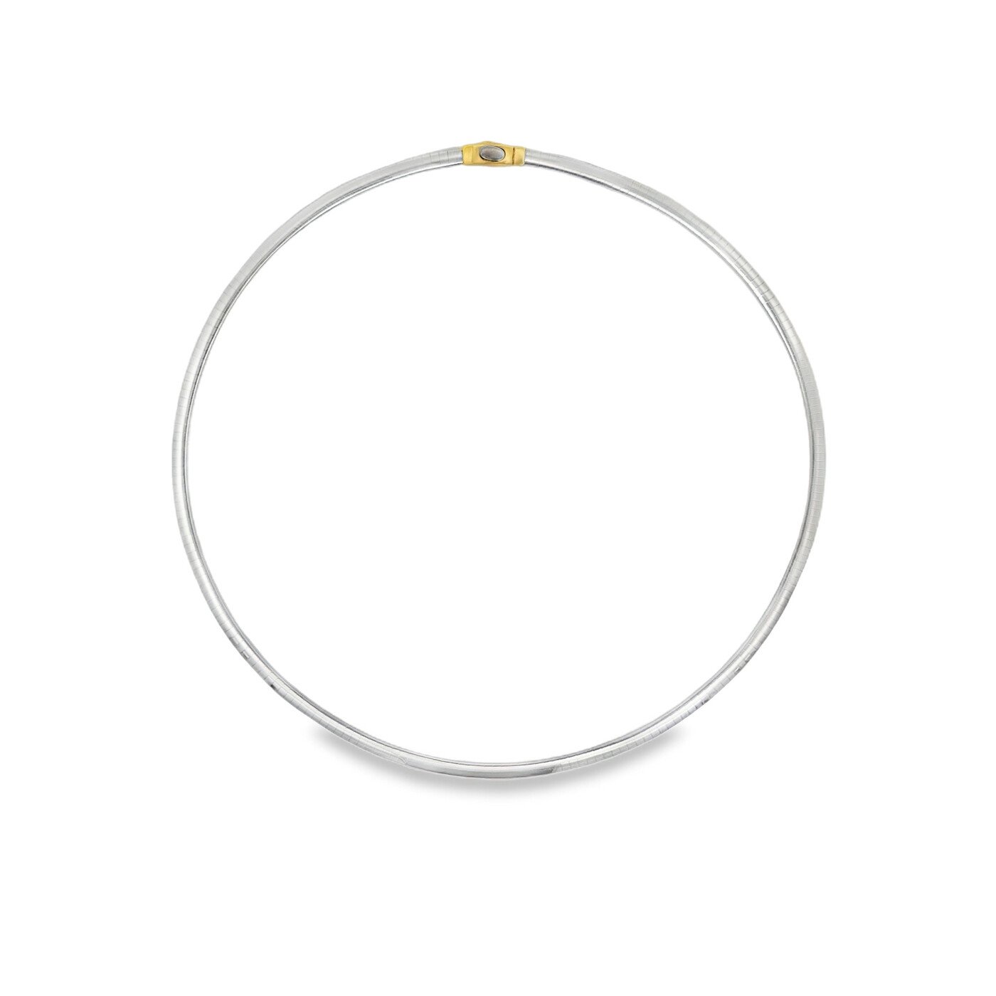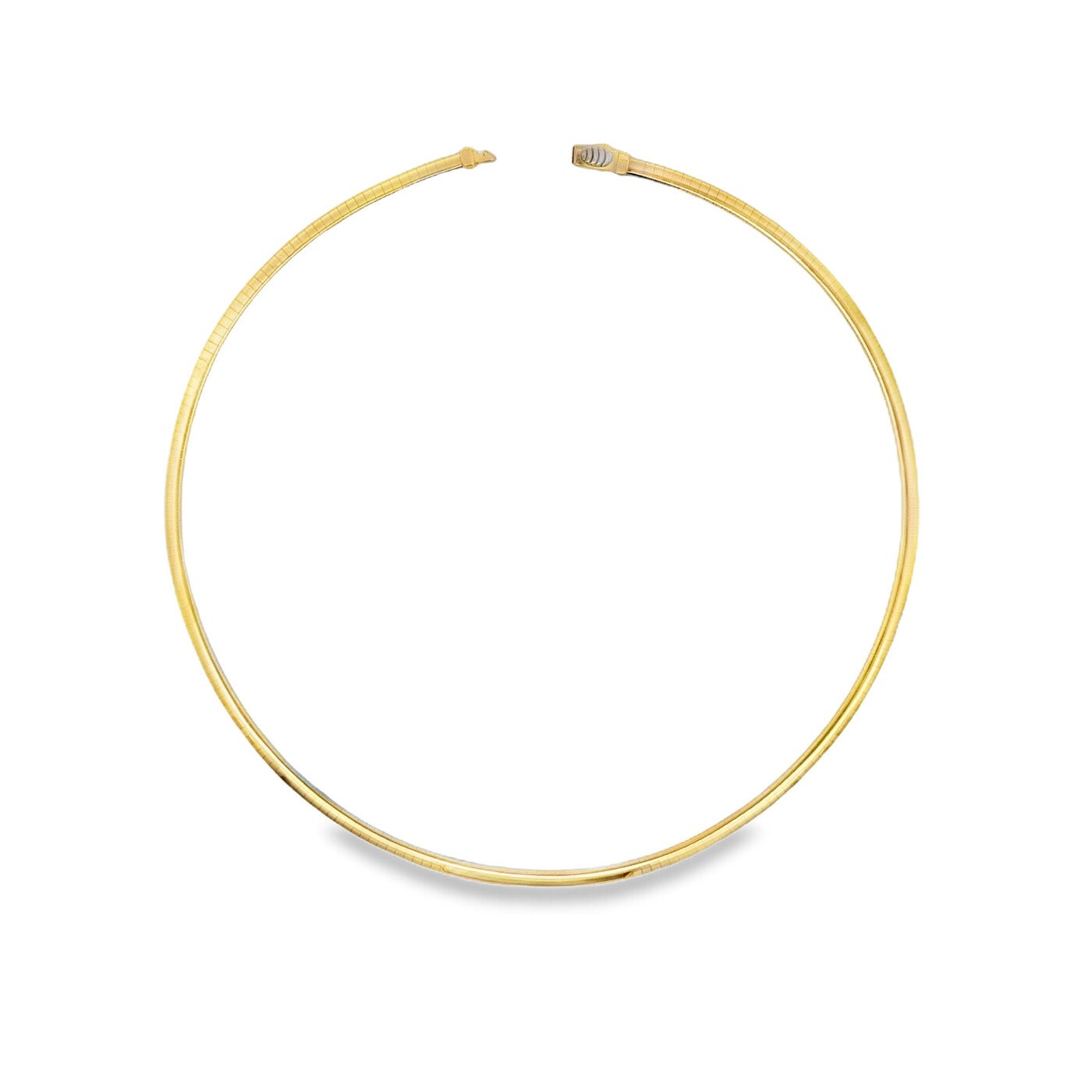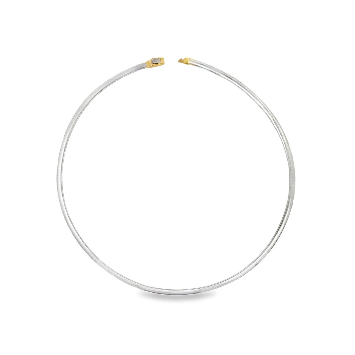 Polished yellow and white gold surfaces create a reversible omega design with two distinct looks. The sleek form offers a timeless and versatile finish.