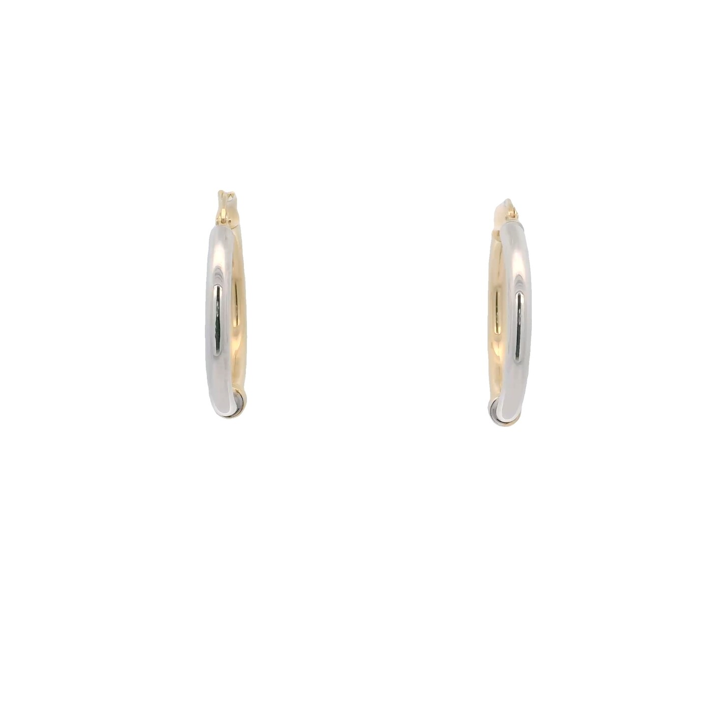 ITEM#: GCB008718Discover the beauty of these elegant two-tone hoop earrings, designed to elevate any outfit. Crafted with a stunning combination of silver and gold tones, they offer a modern twist on a classic style.