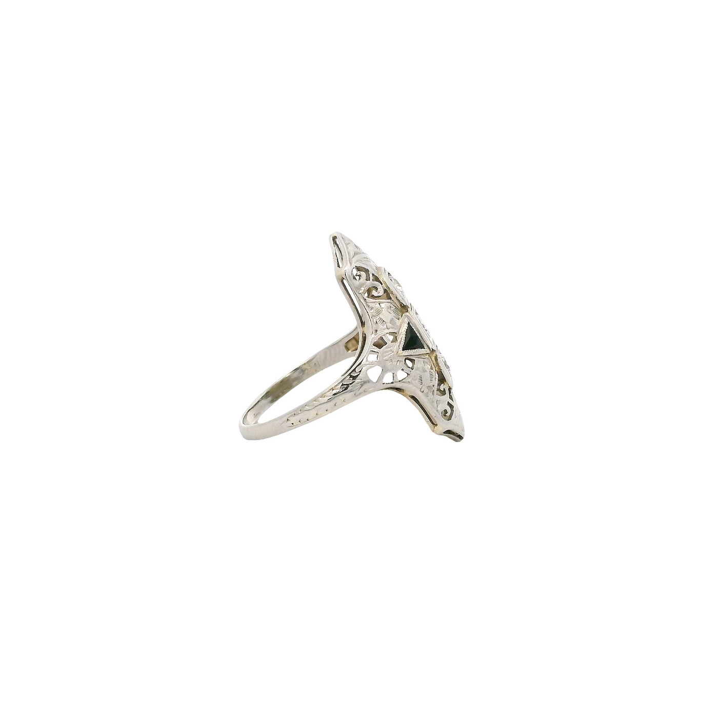 ITEM#: GCB00005591This white gold Art Deco ring showcases a sparkling diamond framed by polished onyx. The intricate filigree design adds refined detail, creating a timeless piece with vintage elegance.
