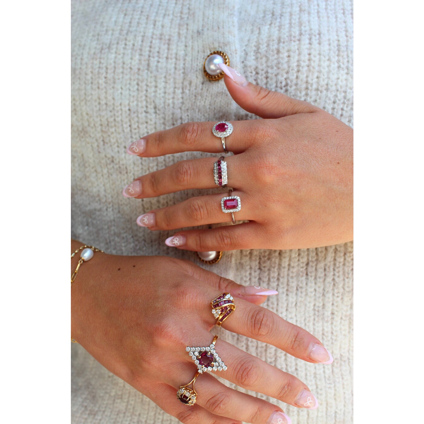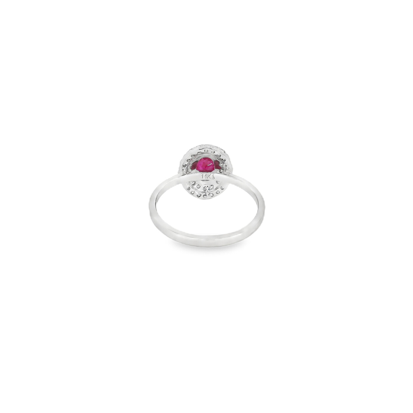 $2,350.00 ITEM#: GC200685A rich ruby sits at the center of this ring, framed by a double diamond halo in an 18K white gold setting. The 14K white gold shank adds subtle contrast to a design that balances warmth, brilliance, and timeless style.