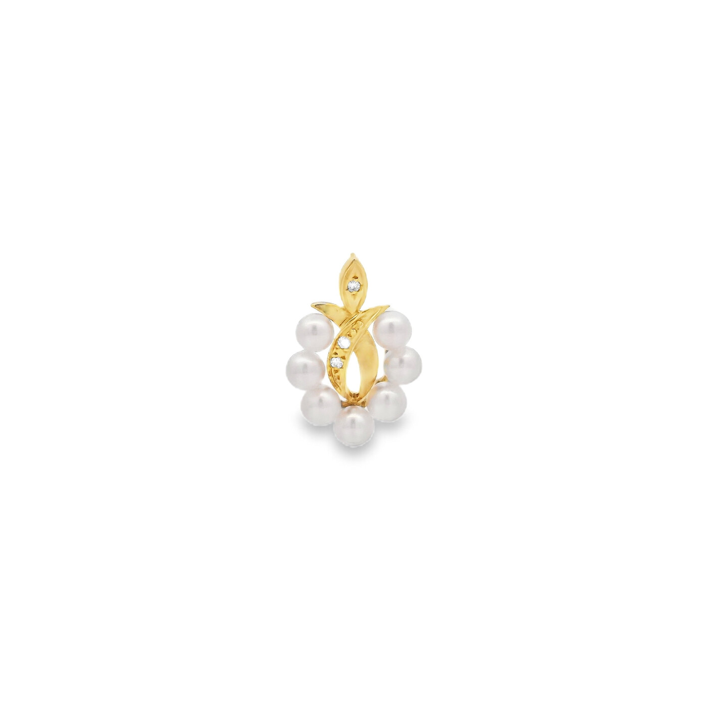 18K Yellow Gold 1970's 4-4.5mm White Freshwater Pearls .03ct Diamond Pendant