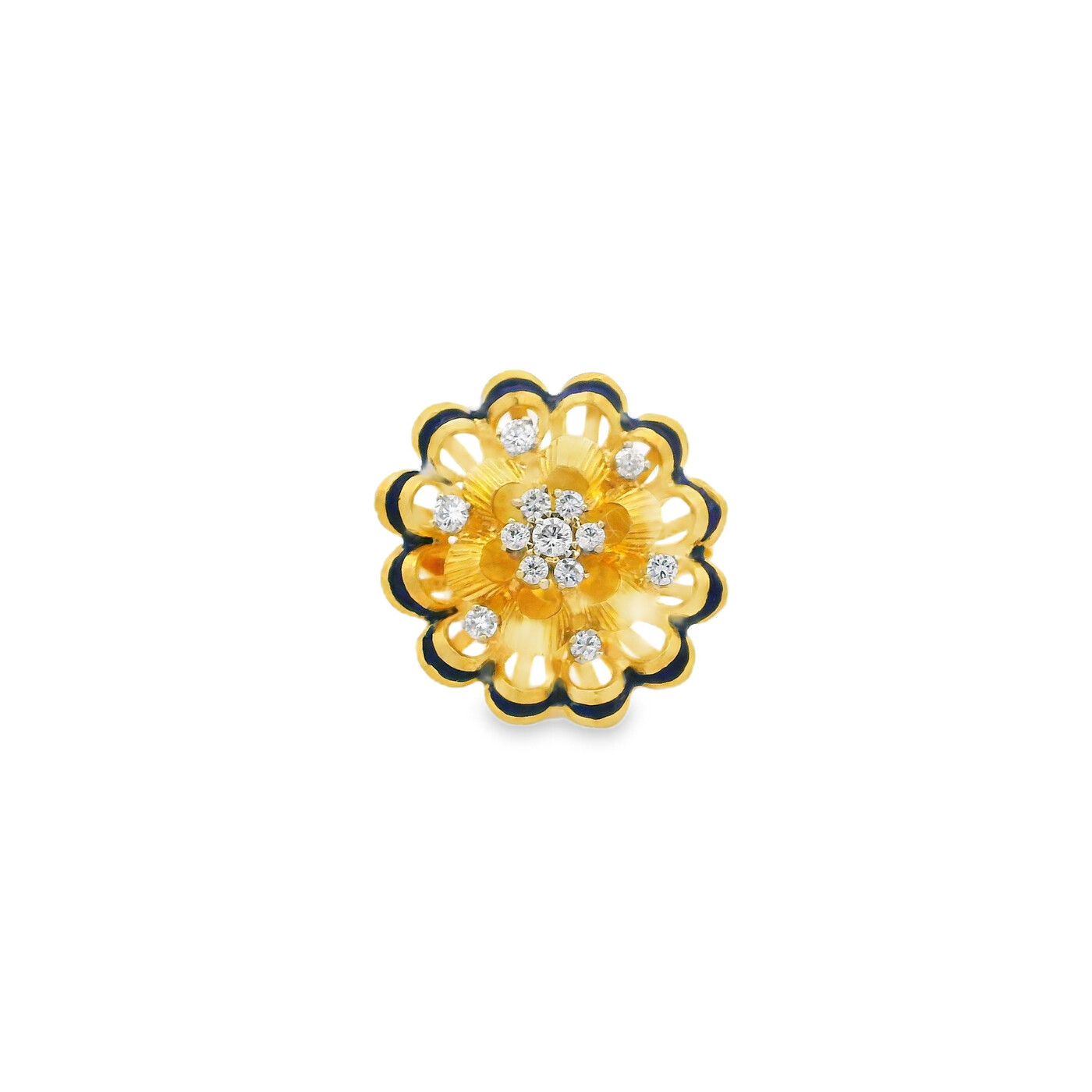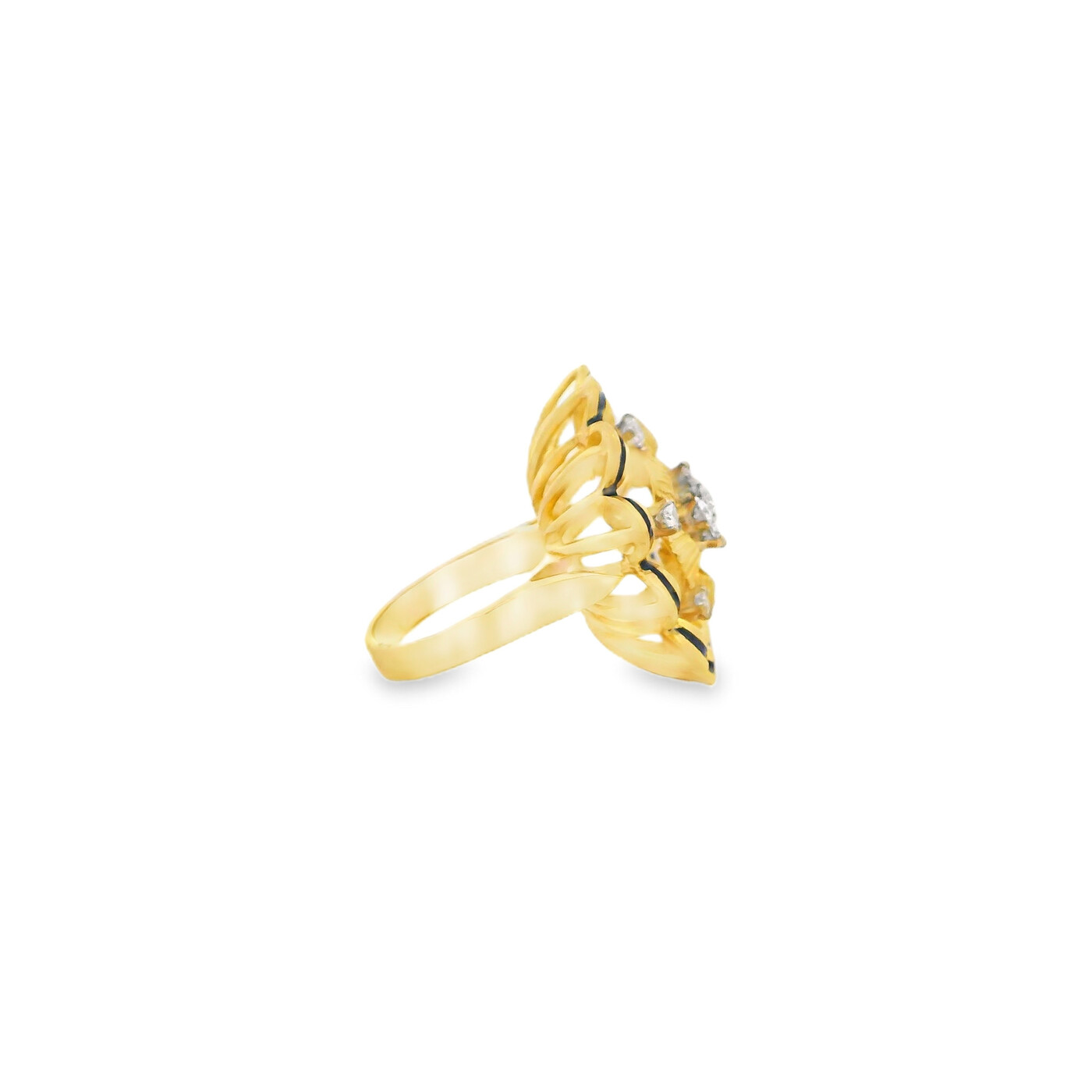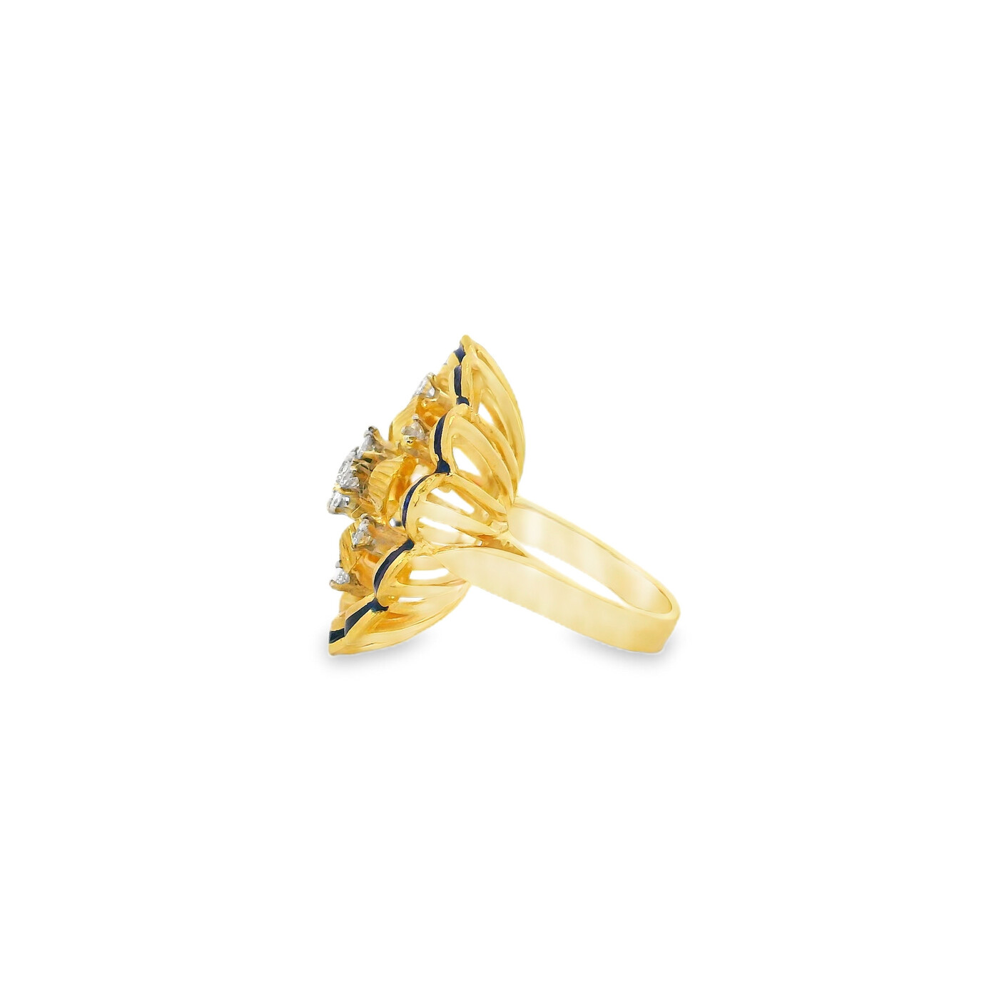 This 1970s cocktail ring features a diamond flower cluster framed by rich blue enamel in 18K yellow gold. The bold design reflects vintage glamour and refined detail.
