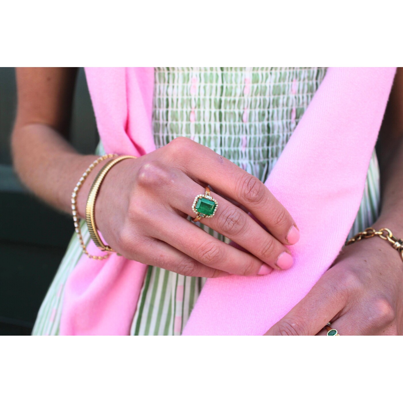 This ring showcases an emerald cut emerald framed by brilliant diamonds in yellow gold. With rich color and timeless design, it captures elegance in a classic setting.