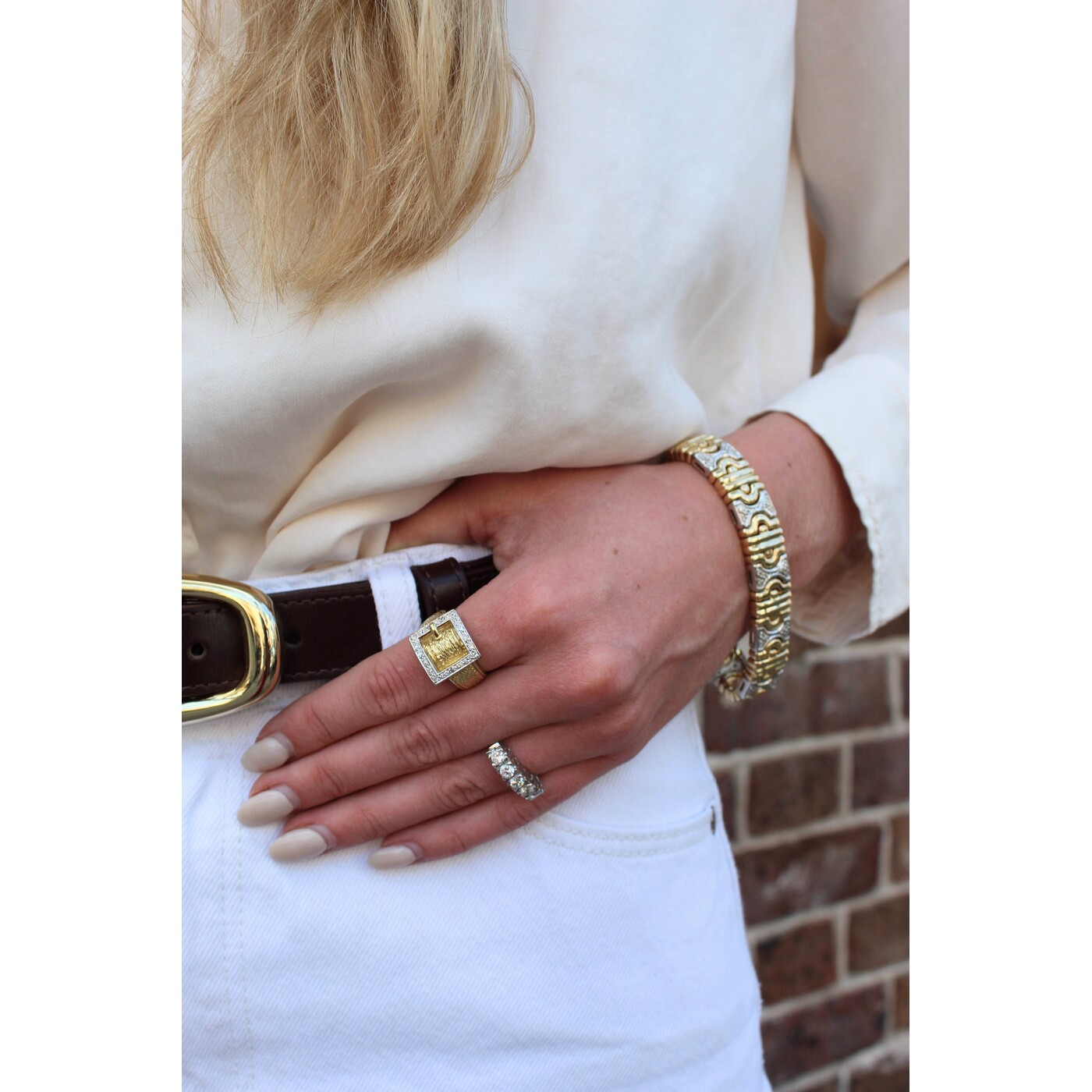ITEM#: GCB00008636A bold nod to vintage design, this sculptural ring pairs richly textured 18k yellow gold with a sleek white gold buckle, accented with shimmering diamonds. Confident and refined, it blends softness and structure in a way only the 1970s could.