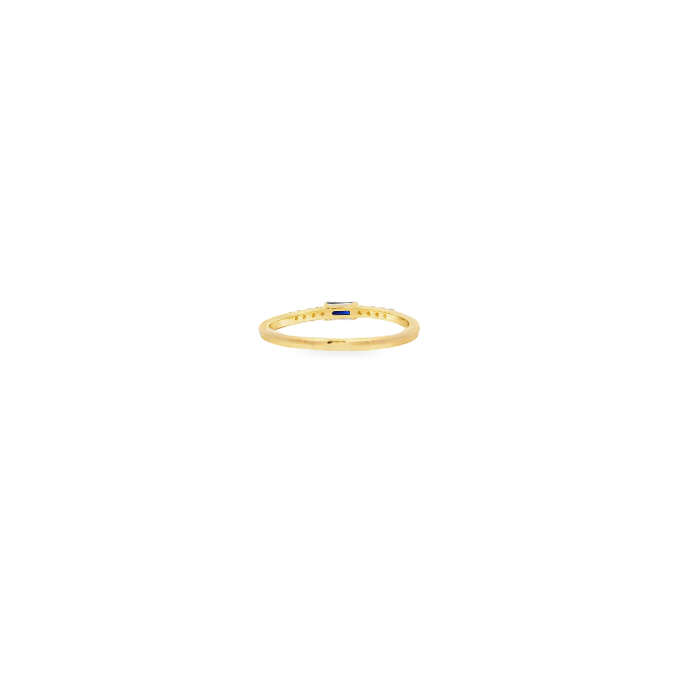 A yellow gold band set with a row of deep blue baguette sapphires accented by diamonds. The structured layout gives it a clean, modern look with a nice contrast of color and sparkle.